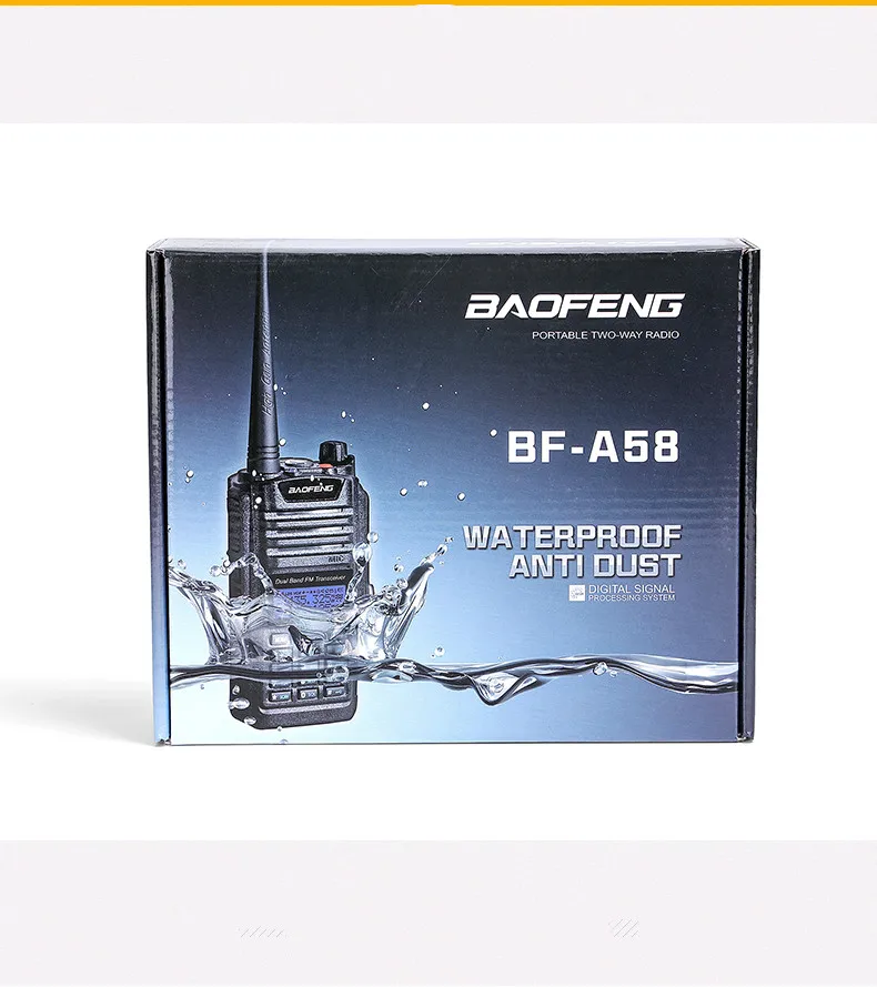 Рация Baofeng Bf-a58: Baofeng BF-A58 рация IP67 водонепроницаемый UHF VHF радио двухдиапазонный A58 двухсторонний радиоприемопередатчик Woki TokiОсобенности: -Выход: 5 Вт (В)/4 Вт (м)/1 Вт (л) -Частотный диапазон: 136,00-174,00 МГц/400,00-520,00 МГц -IP57 водонепроницаемый и пылезащитный (не дайвинг) -Переключатель высокой и низкой мощности -Батарея экономии -VOX Функция -Широкий/Узкий выбор браслета -Автоматическая подсветка -Двойной режим ожидания -Таймер таймера (TOT) -50 кодов CTCSS и 104 DCS -Голосовые подсказки -Ani-код -ПК или ручная программа -Dtmf-код -PTT-ID -ATUO блокировка клавиатуры -Занят замок с блокировкой Функция -Двухдиапазонный, двойной дисплей и двойной режим ожидания -Аварийной сигнализации -Сканирования Функция -Подтверждение передачи реле (1750 Гц) -Низкая Батарея Предупреждение -U/V поперечная полоса двойные часы Посылка включает в себя: -1 x портативное радио -1 x Антенна -1 х литий-ионный аккумулятор -1 х настольное зарядное устройство -1 х адаптер питания -1 х Зажим для ремня -1 х слинг -1 х Руководство пользователя