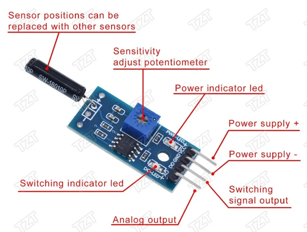Для различных вибрационных срабатываний, сообщают о краже, интеллектуальном автомобиле, электронных строительных блоках.Обратите внимание, что этот модуль запускает очень короткое время при обнаружении большого шока, недостаточно для привода реле, данные показывают, что некоторые люди могут быть подключены непосредственно к релейному модулю, практическое применение неэффективно.Описание модуля: