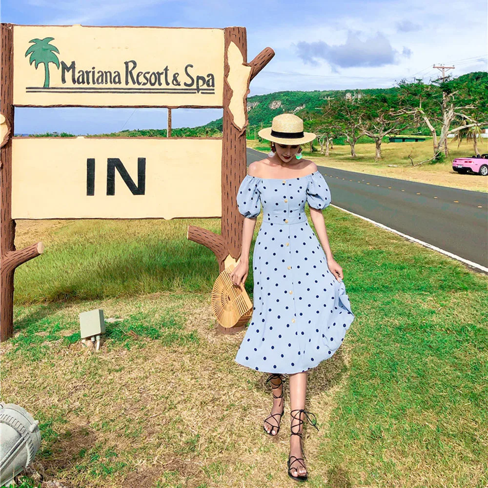 Женское платье с открытыми плечами, летнее ТРАПЕЦИЕВИДНОЕ платье в горошек с пышными рукавами, винтажное пляжное платье большого размера в Корейском стиле