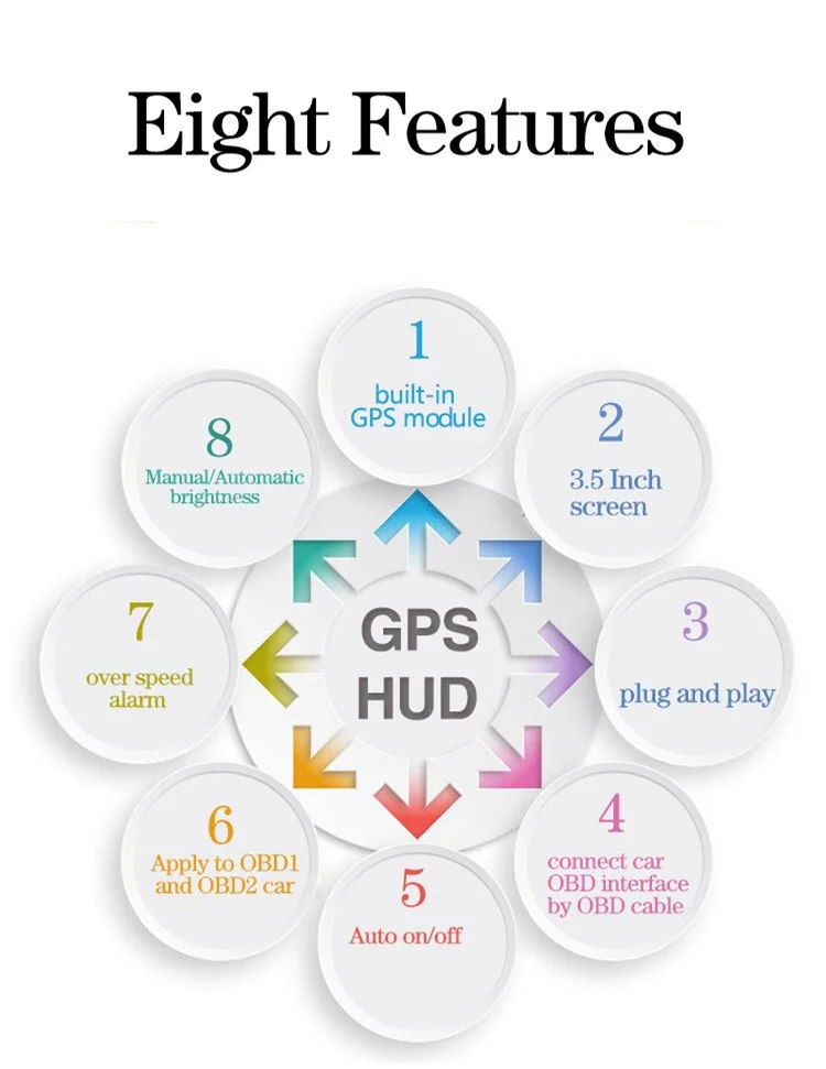 Функции: Дисплей: скорость транспортного средства, в режиме реального времени, компас, расстояние и время вождения, напряжение, номер satellie Сигнал тревоги: Скорость сигнализации Совместим с GPS автомобильный HUD поддерживает все автомобили (когда вы не имеете представления о интерфейсе даты Вашего автомобиля, вы можете выбрать GPS HUD