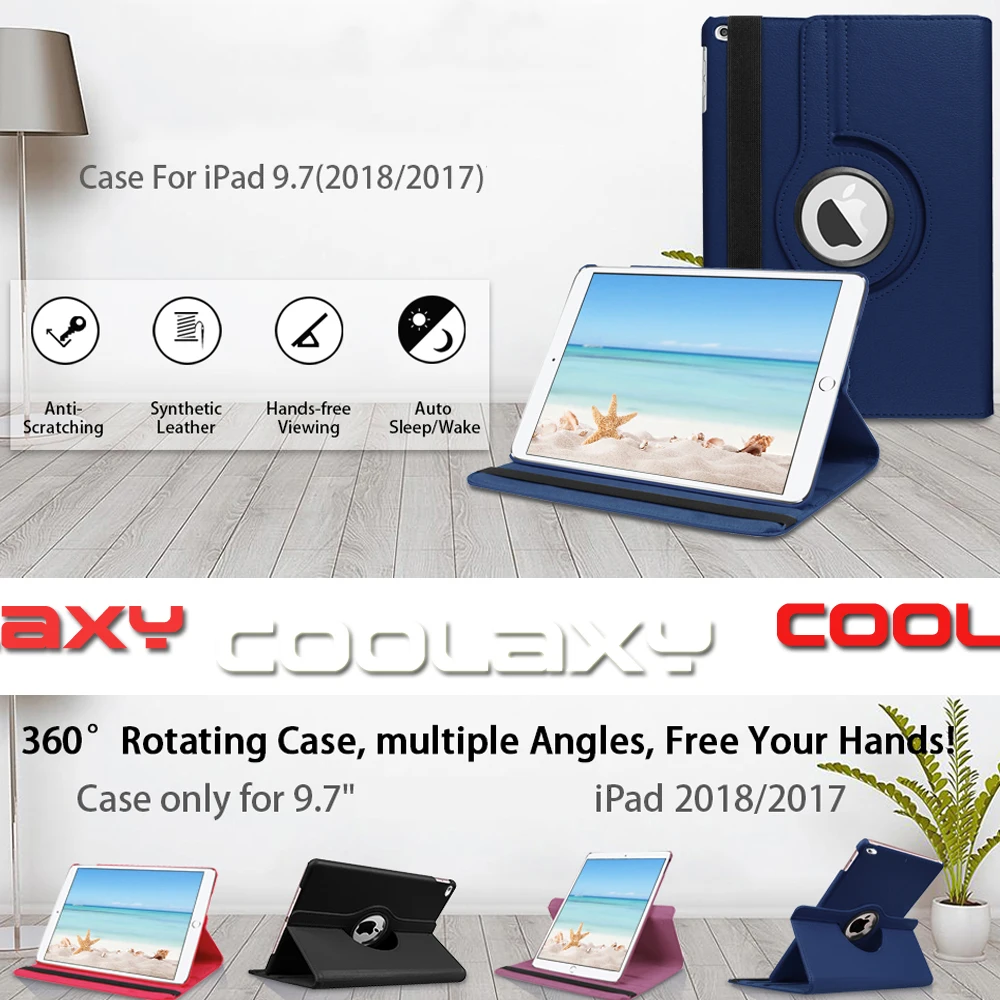 Специально разработано для вашего драгоценного Apple, все новые для iPad 9,7 дюймов 2018/2017 релиз планшета (модель A1893/A1954/A1822/A1823), coolaxy предлагает вам превосходный кожаный чехол, который вращается на 360 градусов между горизонтальным и вертикальным положением. Чехол удобно держать, легкий и прочный, действительно Обязательный аксессуар вашего любимого iPad!