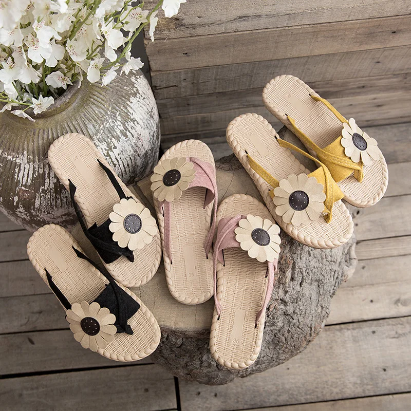Женские пляжные шлепанцы с милым цветком, домашние летние шлепанцы на плоской подошве, новинка 2019