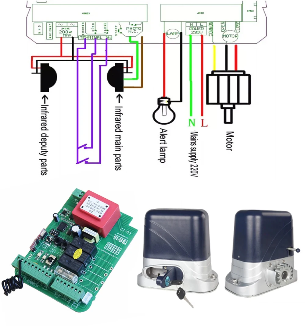1. Одна кнопка может завершить все команды управления (например, закрыть, открыть, остановить.) 2. Может регулировать выходную мощность двигателя 3. Может регулировать время работы двигателя 4. Может запрограммировать время автоматического закрытия 5. Можно установить автоматическое закрытие после восстановления питания после выключения питания. 6. Раздвижные ворота открывалка может подключить мигающий светильник, фотоэлемент, клавиатуры. Электрический замок.