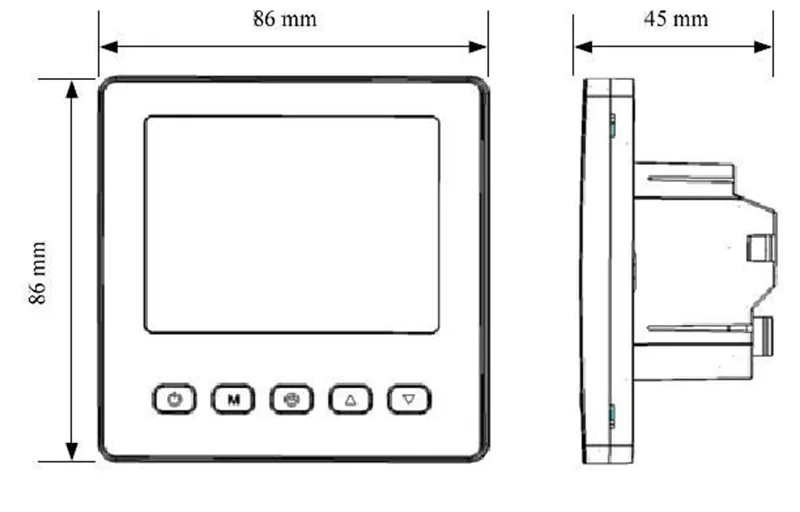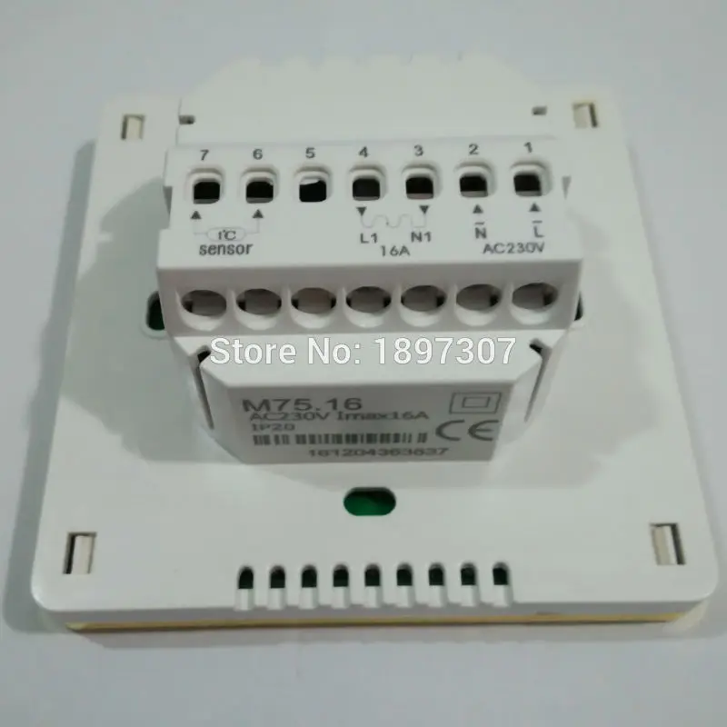 P.S: 16A для электрической системы отопления Рабочее напряжение: 230 В переменного тока Потребляемая мощность: 2 Вт (ВА) Импульсный ток: максимальный нормально закрытый привод 16 А, а также подходящий Электрический нагреватель Диапазон температур: 5 ° C ~ 35 ° C Датчик температуры: внутренний NTC-датчик (внешний датчик пола можно по желанию заказать, импульсный для электрического отопления) Настройка температуры в шагах: ± 1,0 ° C Переключение гистерезиса: регулируемая разница переключения 0,0 ° C - 10 ° C Точность измерения: 1 ° C Класс защиты: IP20 Размеры корпуса: 86x86 мм Монтаж в стандартную верхнюю коробку Ø 60 мм Материал корпуса: самогасящий ПК Напольный датчик: резина-термопластичный датчик NTC, длина кабеля 3 м