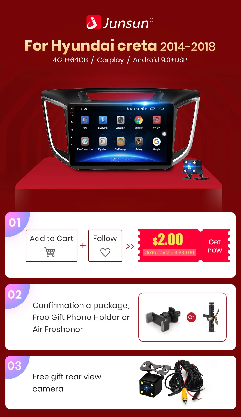 > Junsun V1 pro для хендай крета магнитола Основная функция: > Android 9,0 Intel Octa Core 1,8 GHZ cpu (опционально), высокое качество и более стабильный > 4 Гб (2 Гб опционально) вспышка 64 Гб памяти (32 Гб опционально), более гладкая и быстрая; > Gps-навигация (бесплатное обновление карты, только поддержка бренда Junsun) > CarPlay (опционально): легко управлять и обрабатывать Iphone через устройство > DSP (опционально): ontrol различная частота звука, обеспечивает праздник для ушей; > Другая функция: 10.1 дюймов 2.5D сенсорный экран встроенный Wifi (4G сеть опционально) руль управления Зеркало Ссылка Bluetooth Встроенный микрофон FM/AM RDS (опционально) Поддержка USB ADAS DVR (опционально) Европа DAB функция (опционально) 1080P Vedio Play HD 1024*600 Система контроля давления в шинах (опционально) > OSD язык Русский, английский, испанский, итальянский, французский, немецкий, китайский, эстонский, польский, филиппинский, финский, корейский, голландский, хорватский, латышский, литовский, румынский, норвежский, португальский, японский, шведский, тайский, турецкий, украинский, венгерский. > 24H * 7 поддержка сервиса На Junsun Наша цель-усердно работать, чтобы сделать инновационное оборудование и программное обеспечение автомобильного мультимедийного Проигрывателя радио, чтобы дать вам индивидуальный опыт. Мы предоставляем обновления для прошивки, программного обеспечения, навигационные карты GPS бесплатно.