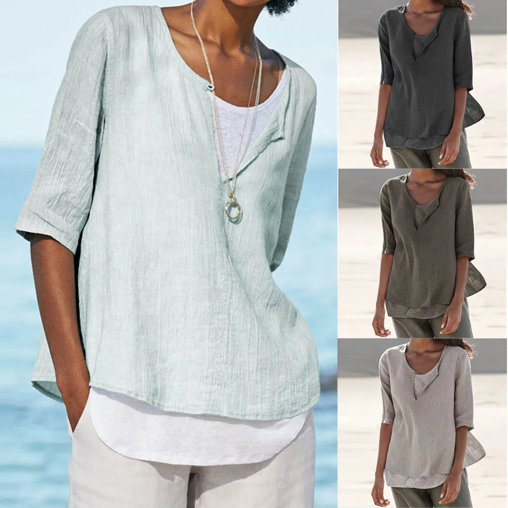 Женская свободная льняная Повседневная блуза на пуговицах с v-образным вырезом больших размеров