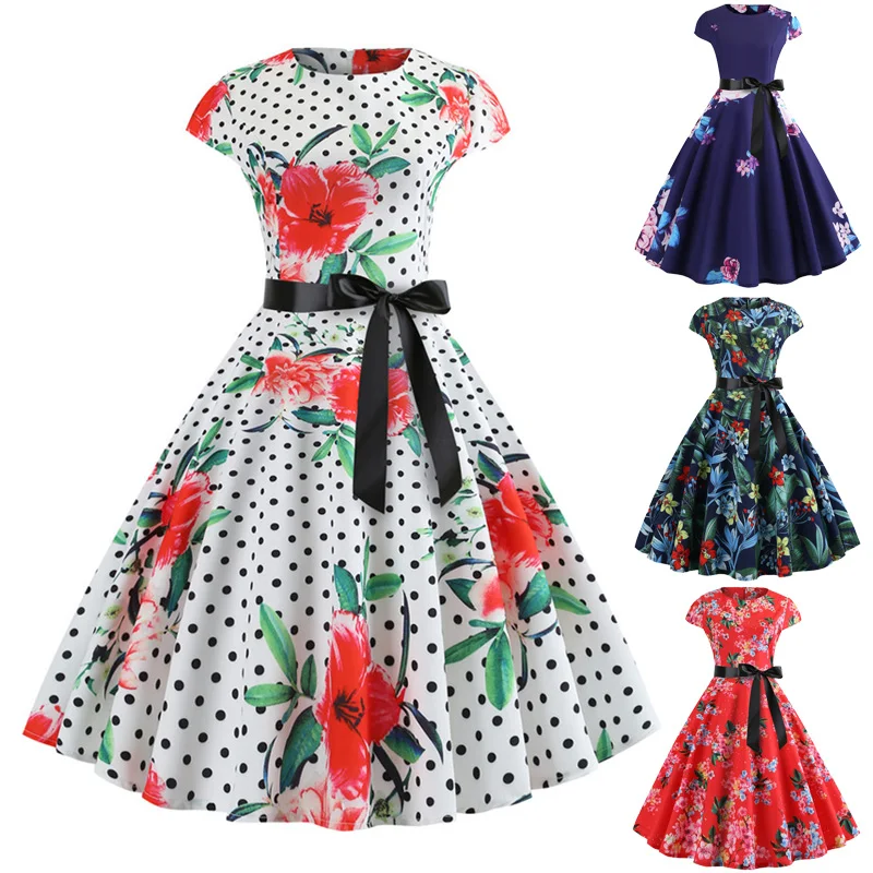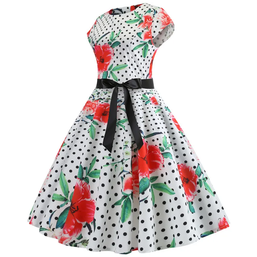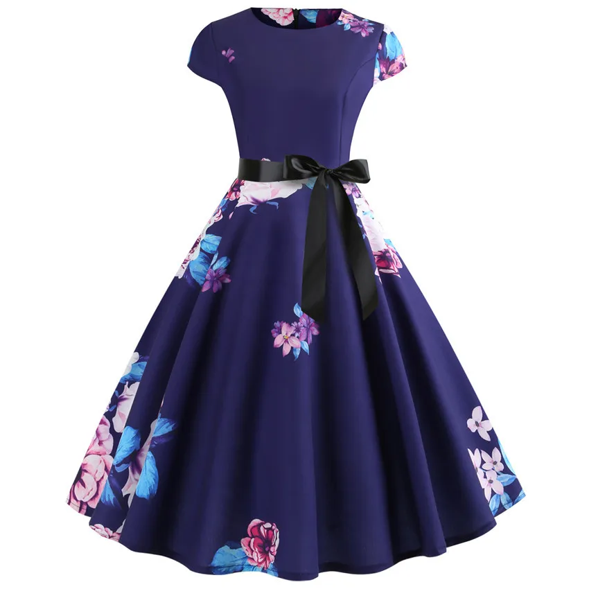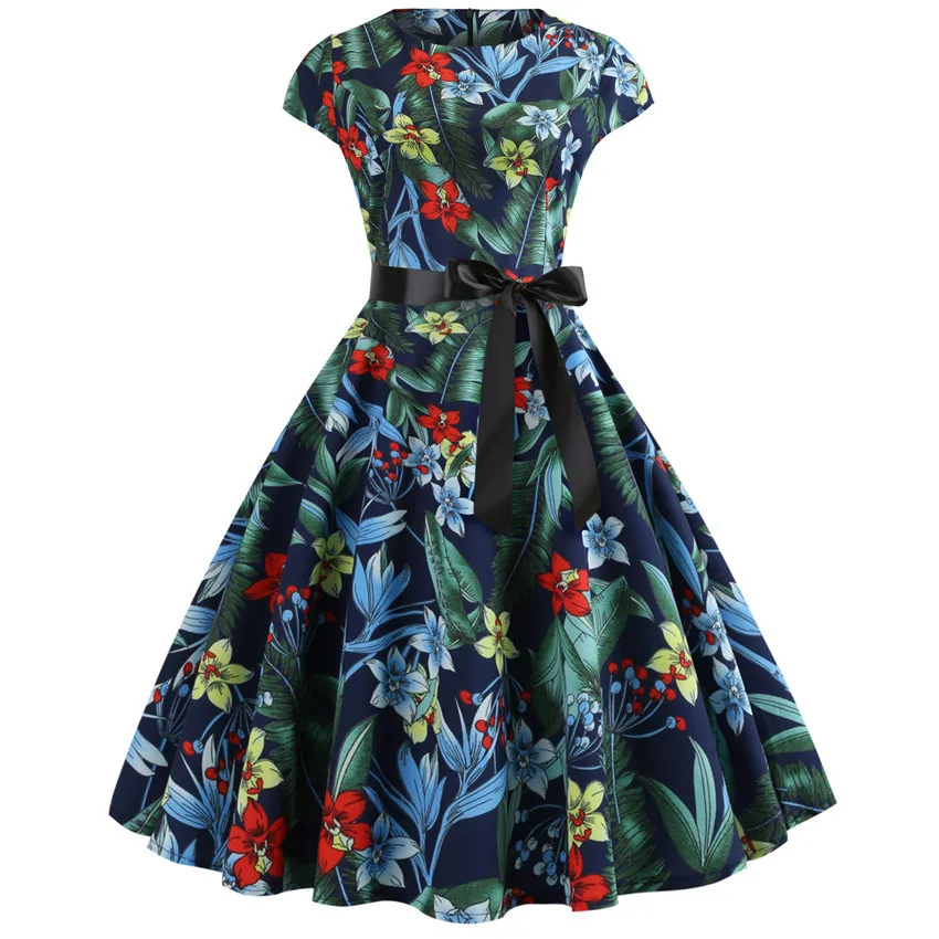 * Описание товара: Ретро, принт, круглый вырез, а-силуэт, облегающий крой, завязывается, большой маятник