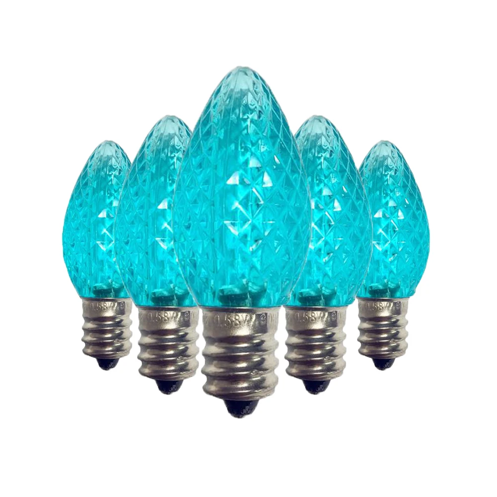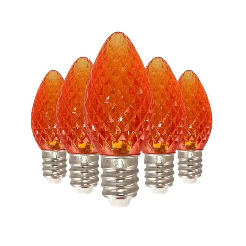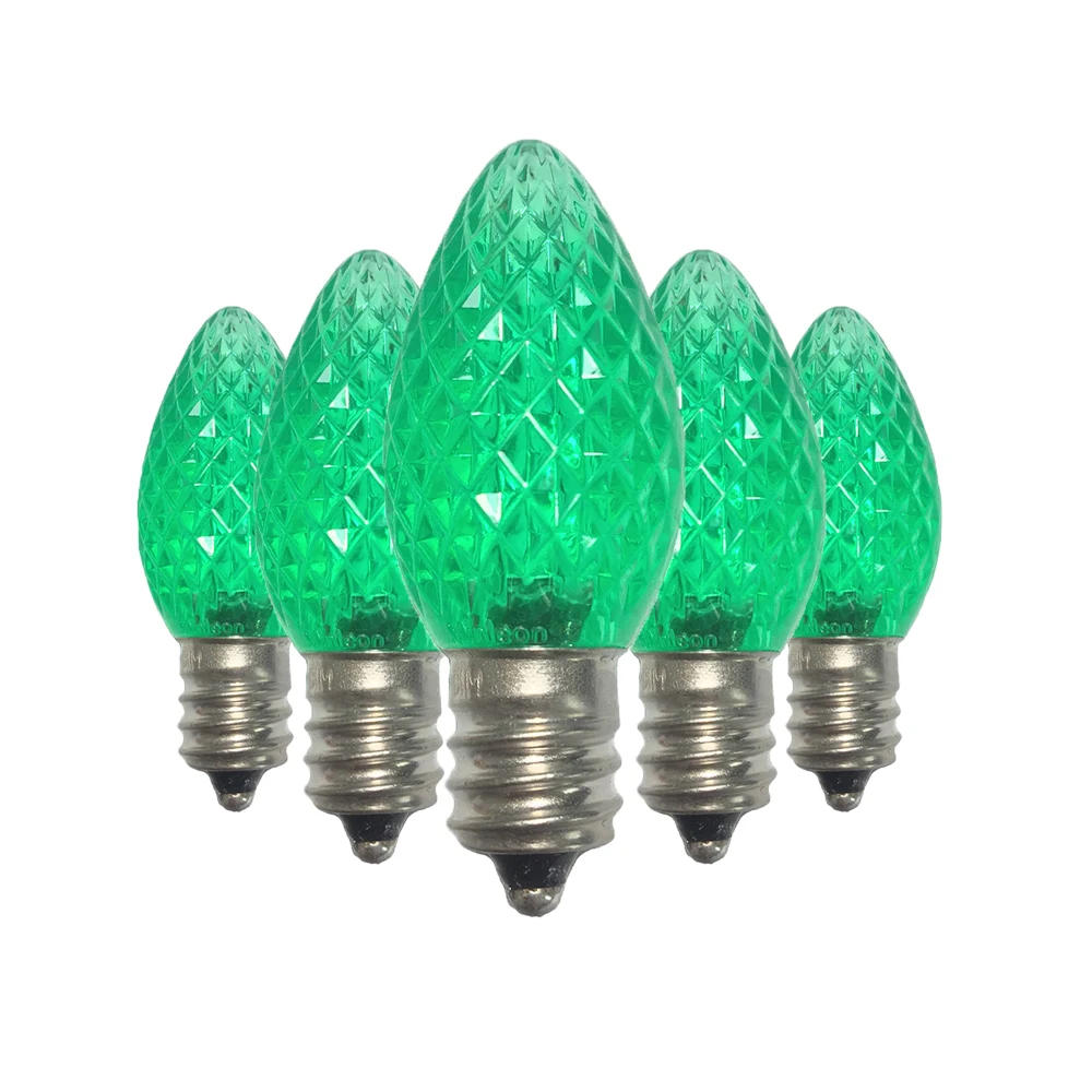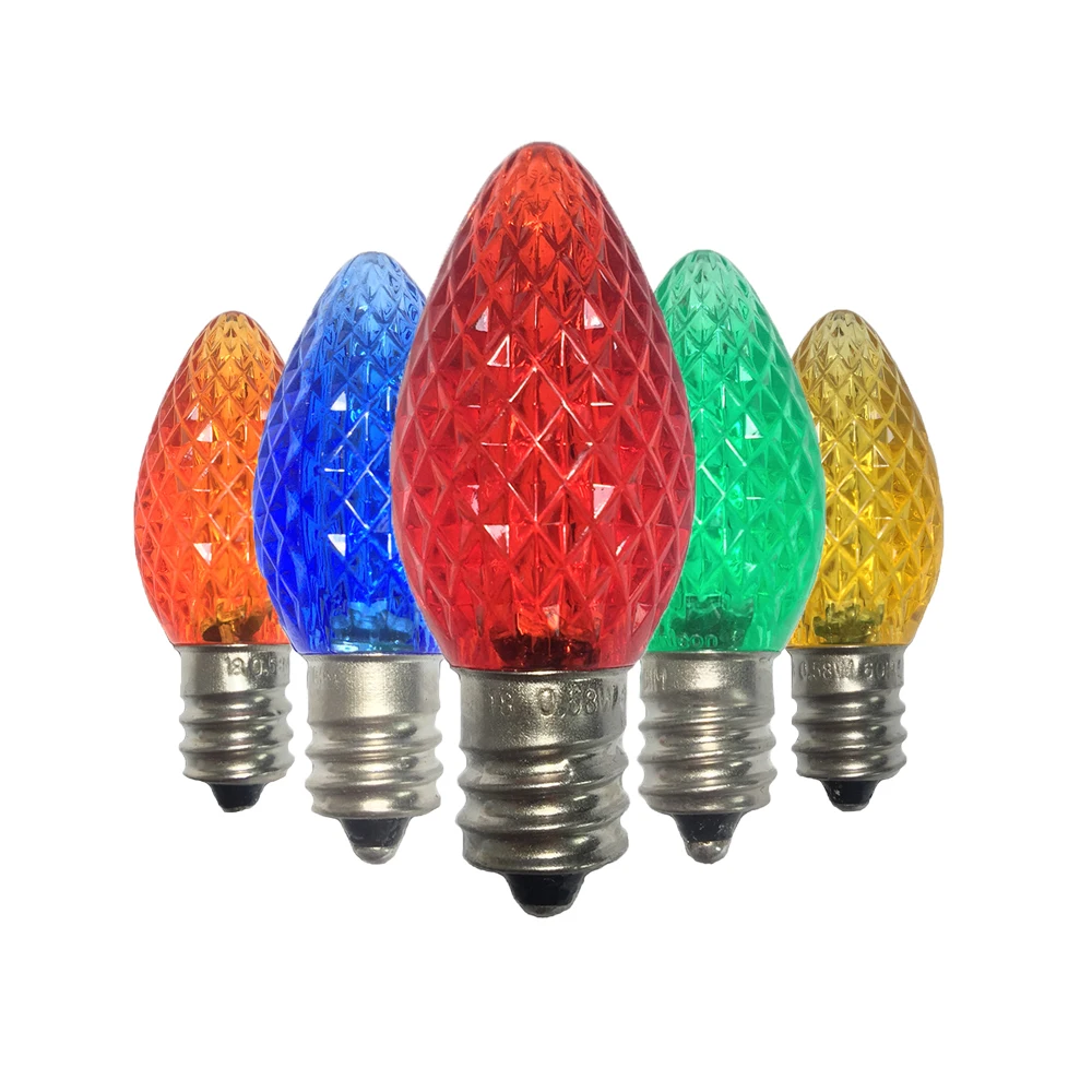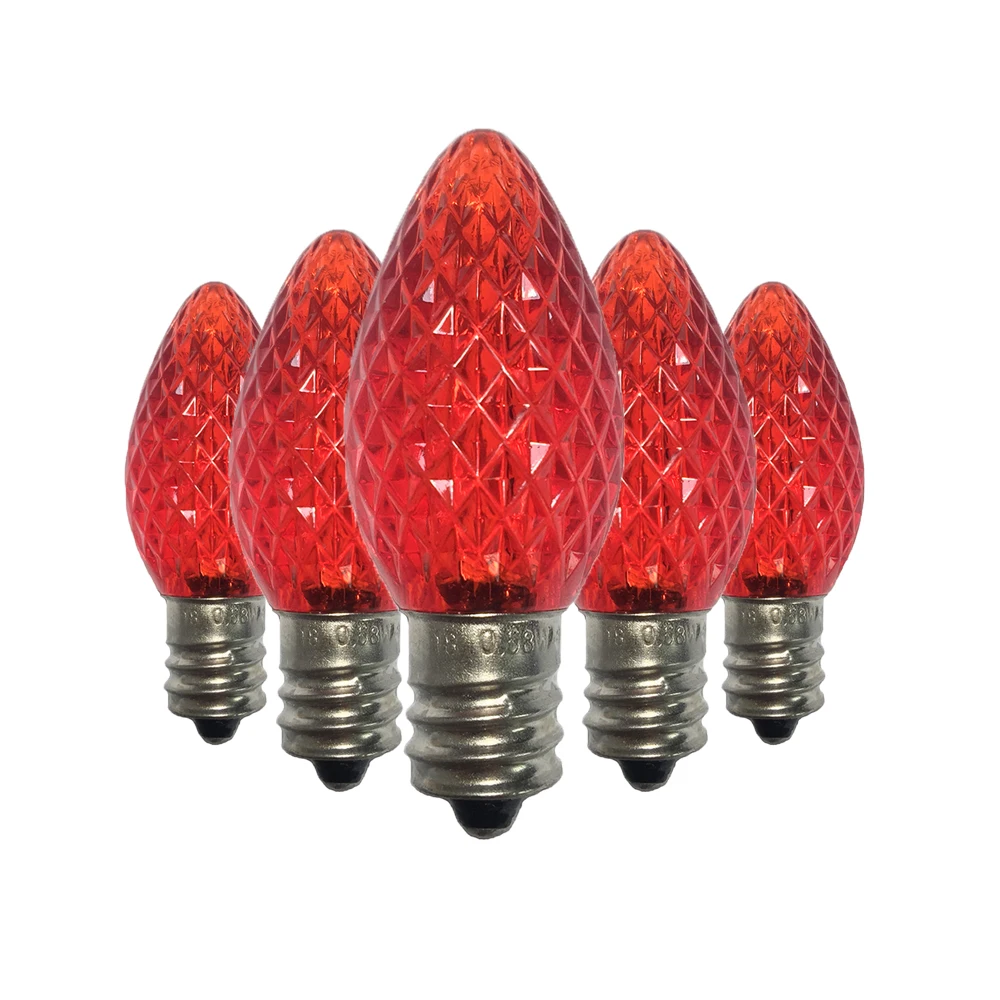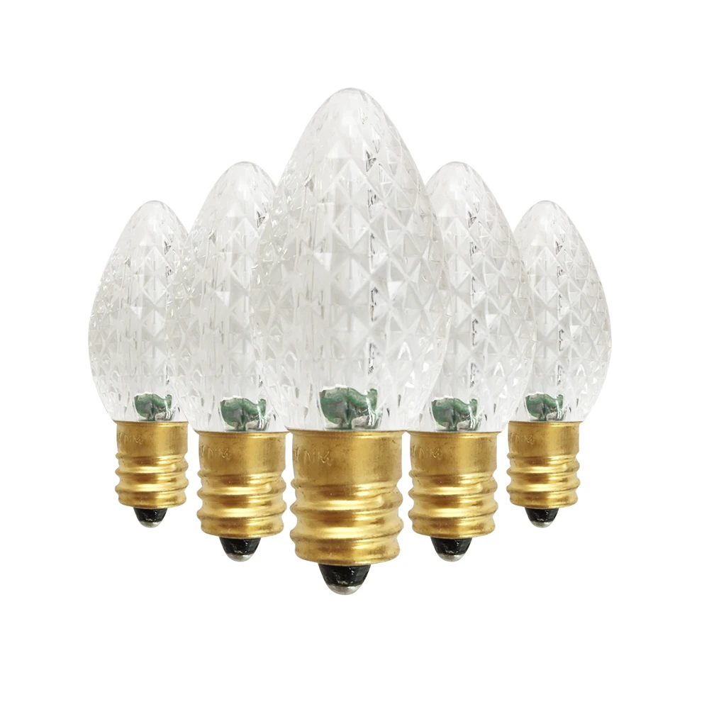 Класс: коммерческий класс и UL; Размер лампы: C7, помещается в основание канделябры E12; Материал лампы: высококачественный и прочный пластик; 2 SMD светодиода в каждой лампе Напряжение: 120 В; Использование: CSA и UL указаны для внутреннего и наружного освещения рождественского праздника; Ватт: 0,5 ватт; Средний срок службы лампы: 90000 часов.
