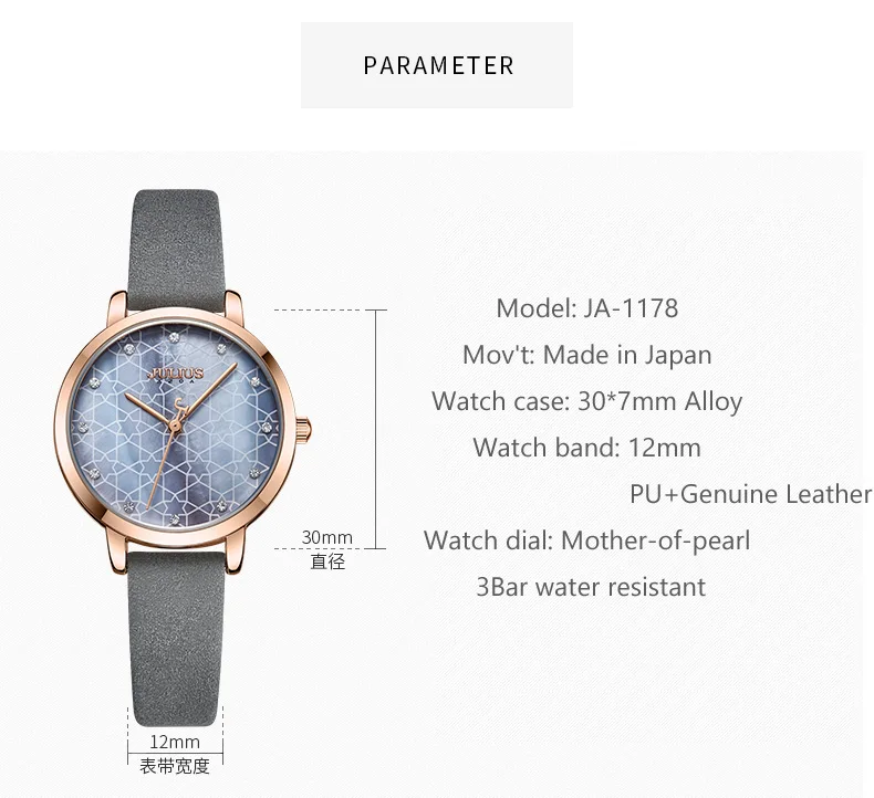 Модель: JA-1178 Mov нет: Сделано в Японии чехол для часов: 30*7 мм сплав ремешок часов: 12 мм ПУ + натуральная кожа 3 бар водостойкий
