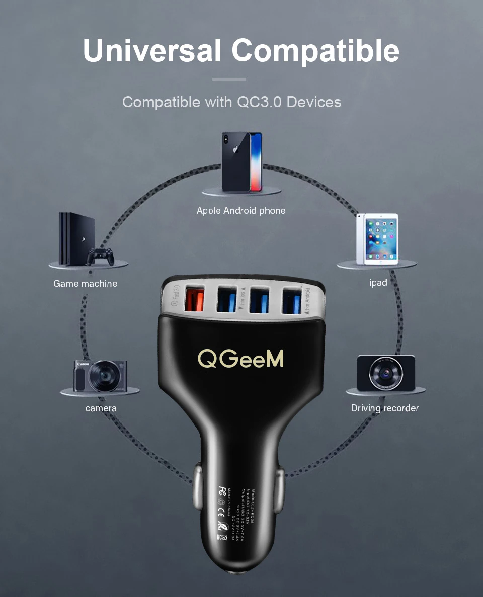 Быстрое Автомобильное зарядное устройство QGEEM с 4 USB-портами, быстрая зарядка 3,0, автомобильное зарядное устройство для телефона QC 3,0, автомобильное зарядное устройство с 4 USB-портами, портативное зарядное устройство для Xiaomi, iPhone