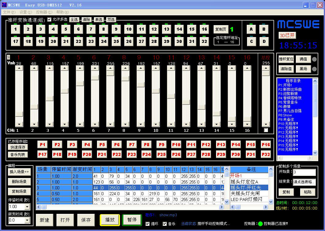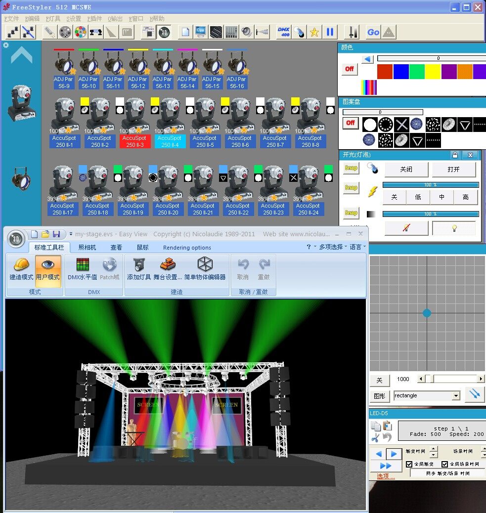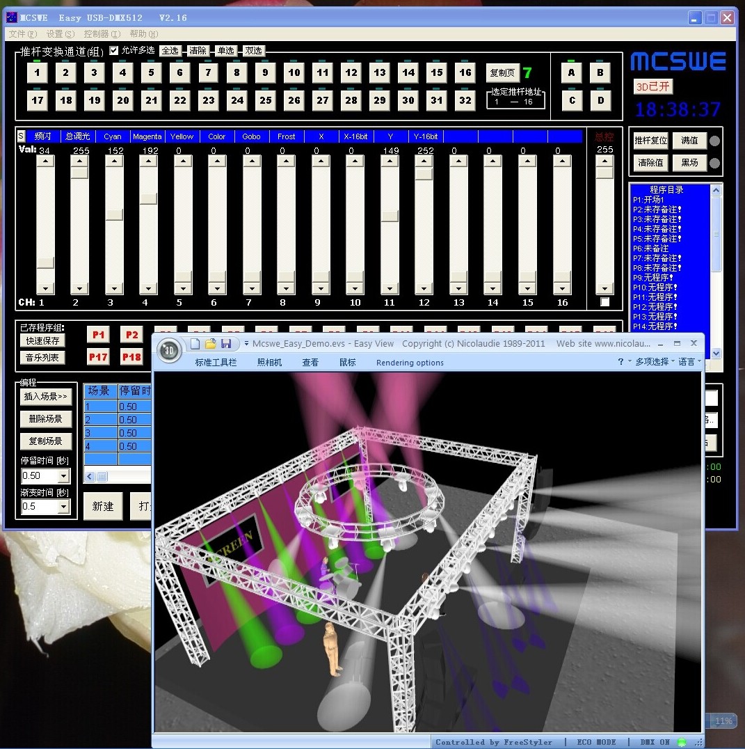 Поддержка FreeStyler (Бельгия) Бесплатное профессиональное программное обеспечение управления освещением! Многие люди в индустрии освещения используют его-с помощью программного обеспечения 3D презентации, даже если вы не на сцене, вы можете отредактировать моделирование шоу светового шоу в 3D сцене! Легко создавать отличные световые эффекты с музыкой! Это программное обеспечение также поддерживает воспроизведение светодиодной матрицы, вы можете использовать сотню десятков rgb-ламп для формирования массива, вы можете показать текст, изображения и другие эффекты!