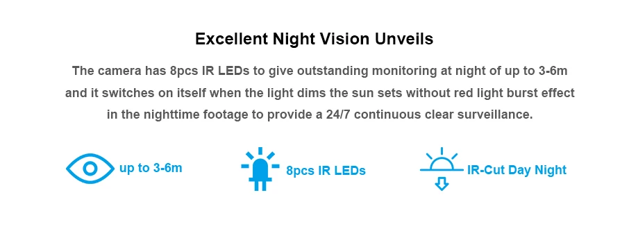 Камера оснащена 8 инфракрасными светодиодами, обеспечивающими превосходный мониторинг в ночное время до 3-5 м