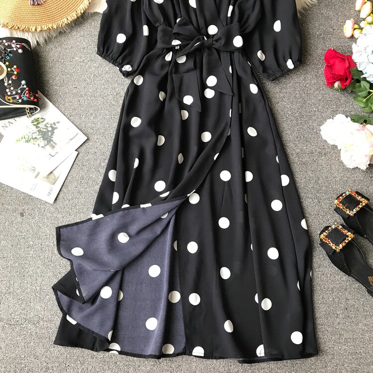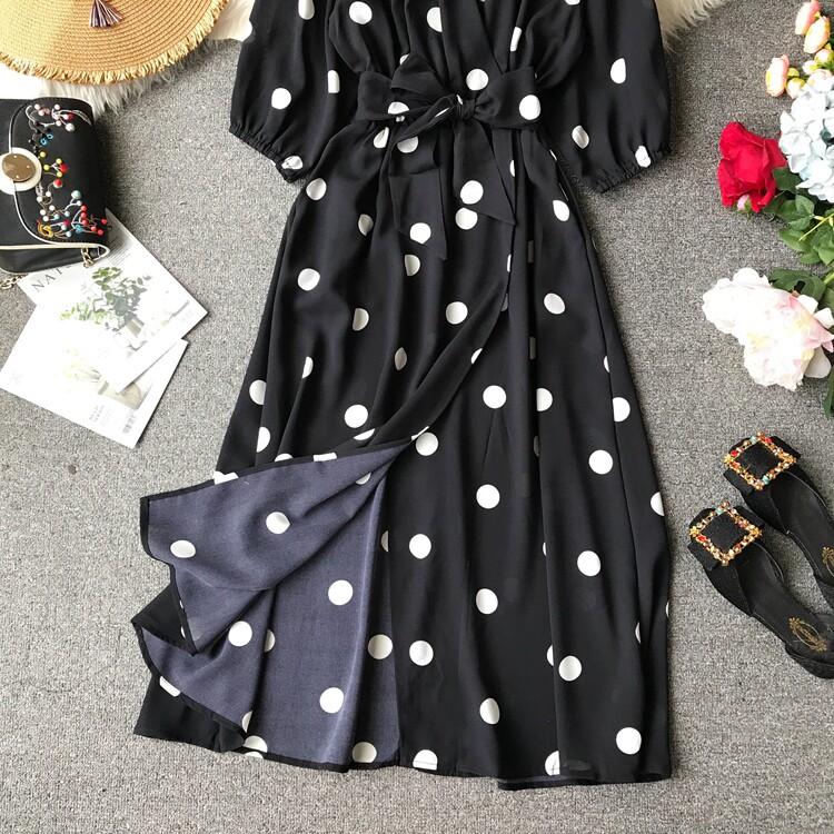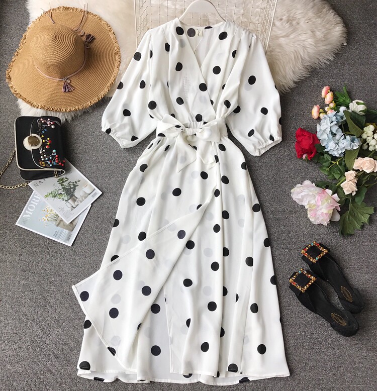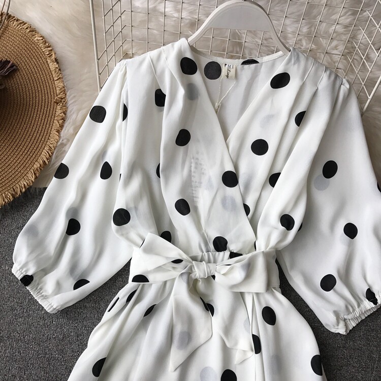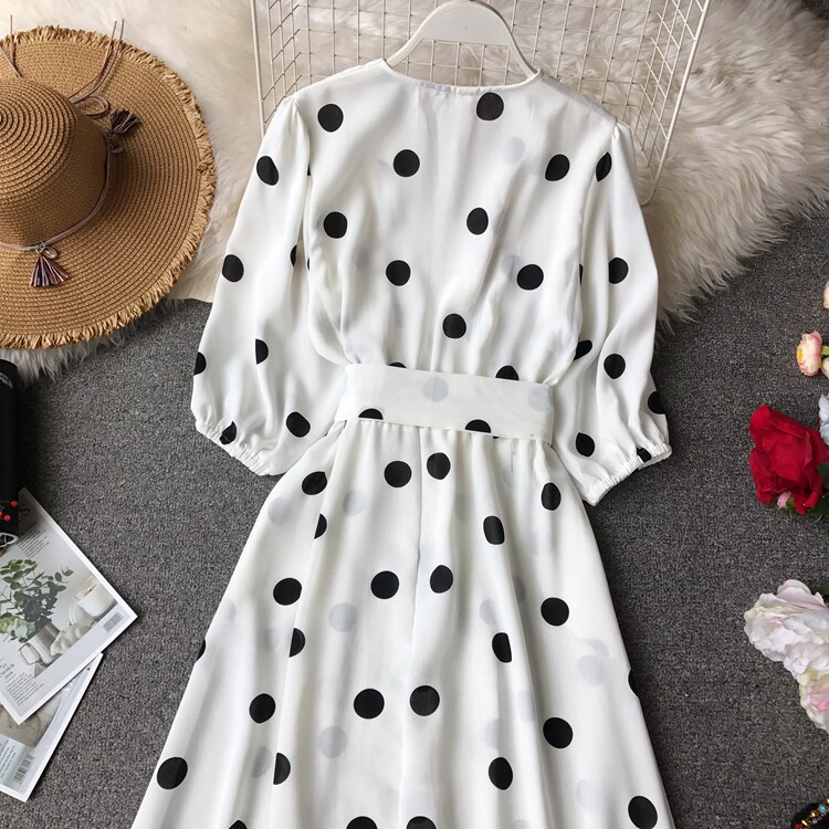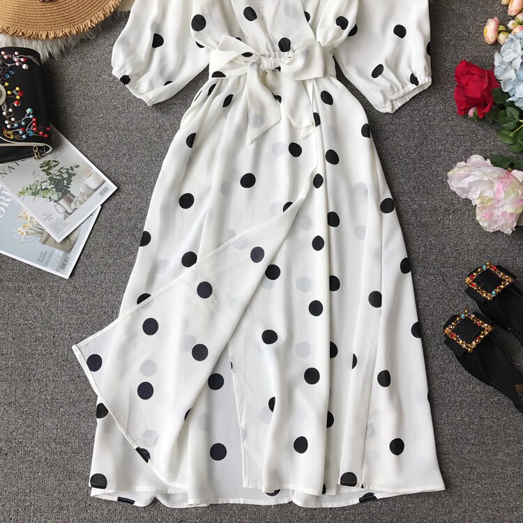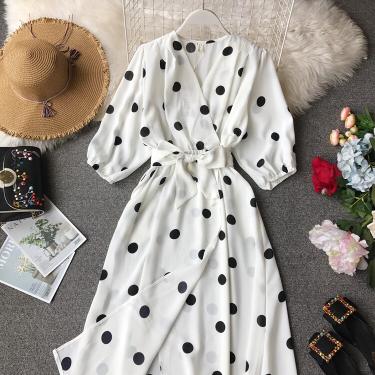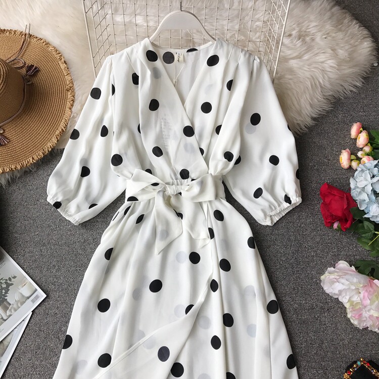 Женское винтажное платье в горошек, праздничное облегающее платье с v-образным вырезом и пышными рукавами, Пляжное ТРАПЕЦИЕВИДНОЕ ПЛАТЬЕ на лето 2019