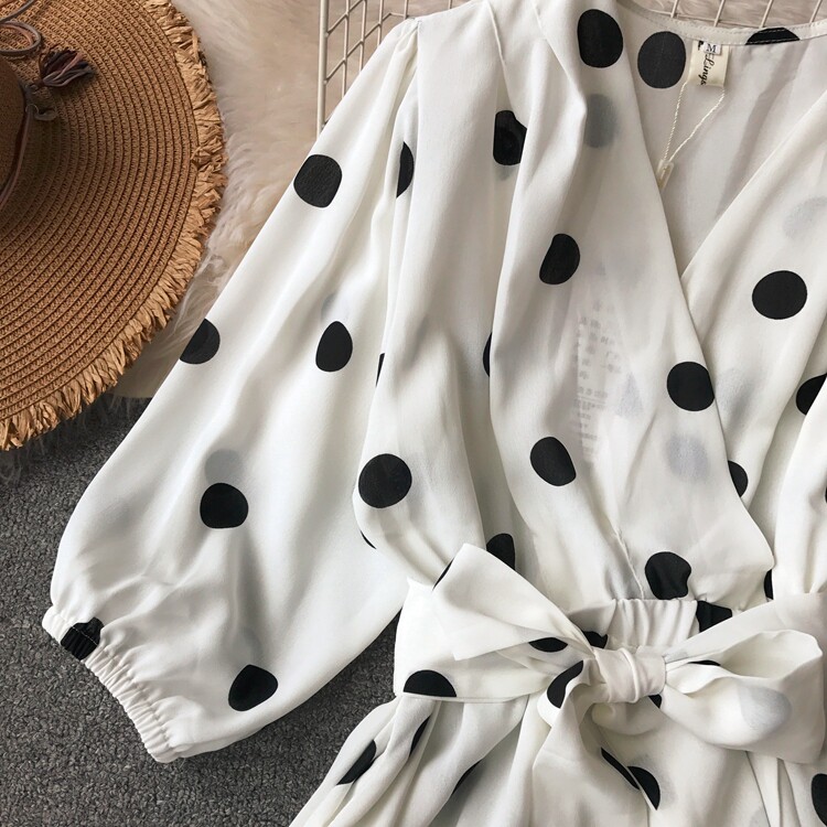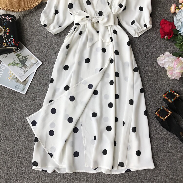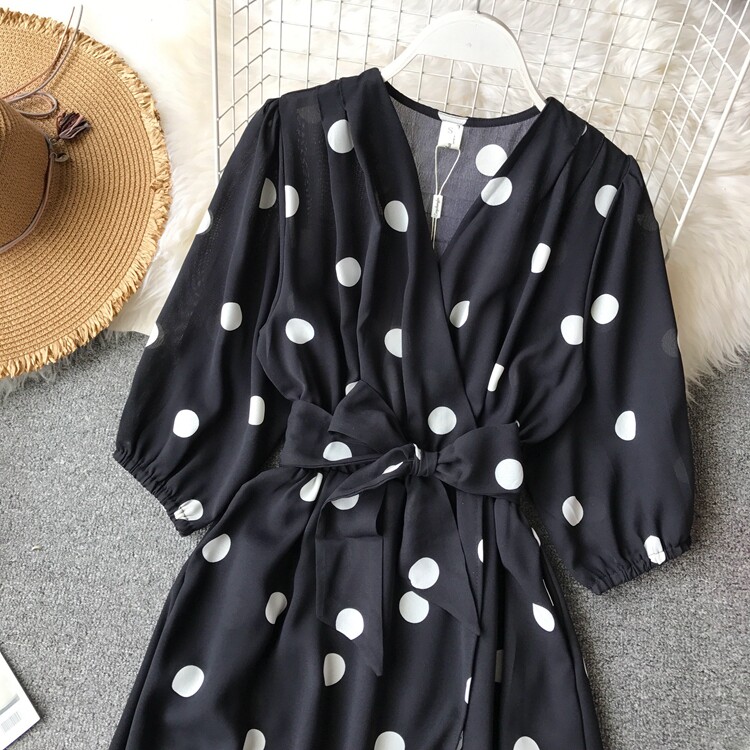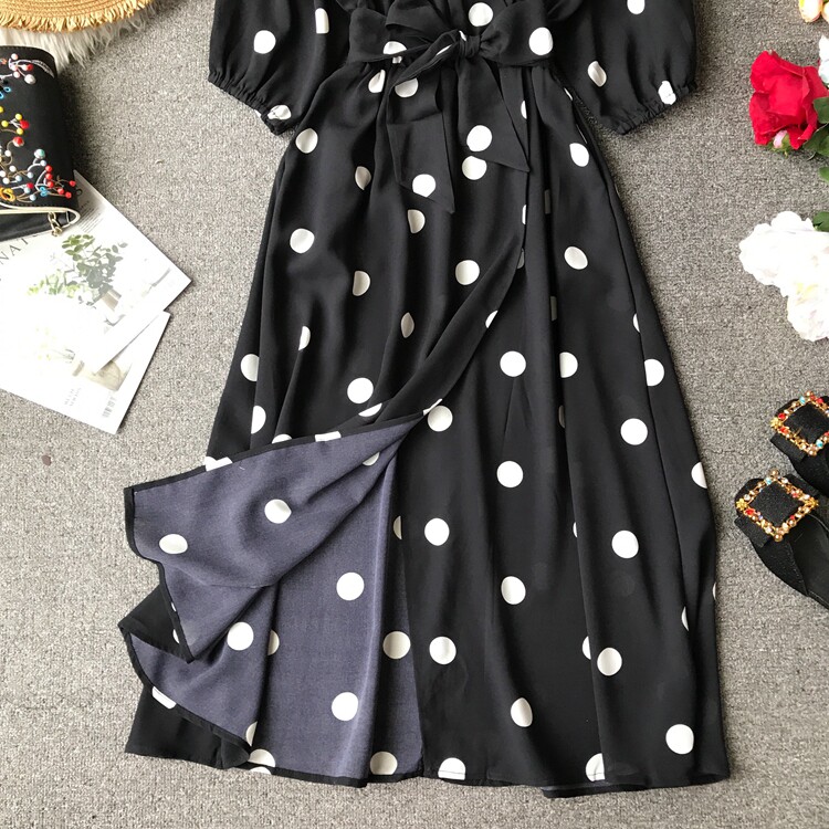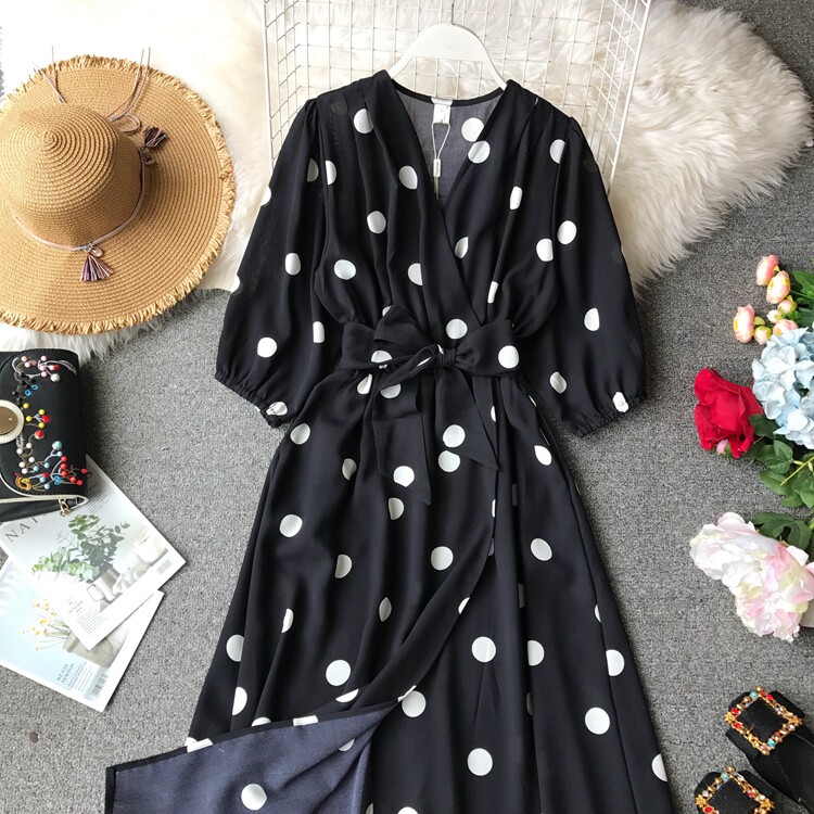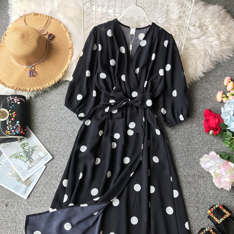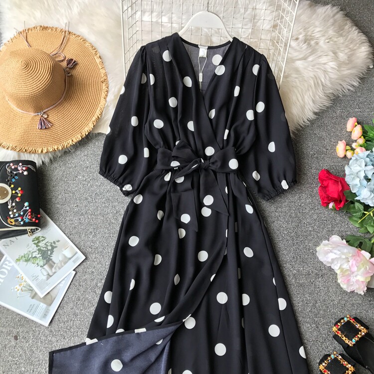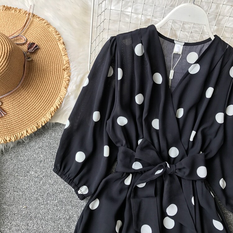 Женское винтажное платье в горошек, праздничное облегающее платье с v-образным вырезом и пышными рукавами, Пляжное ТРАПЕЦИЕВИДНОЕ ПЛАТЬЕ на лето 2019