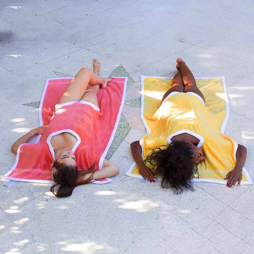 2. Является ли Уникальное и довольно необычное пляжное полотенце, которое можно носить как платье... Или бикини? Это обычное полотенце с отверстием в середине для головы, и Два отверстия внизу для ваших ног.