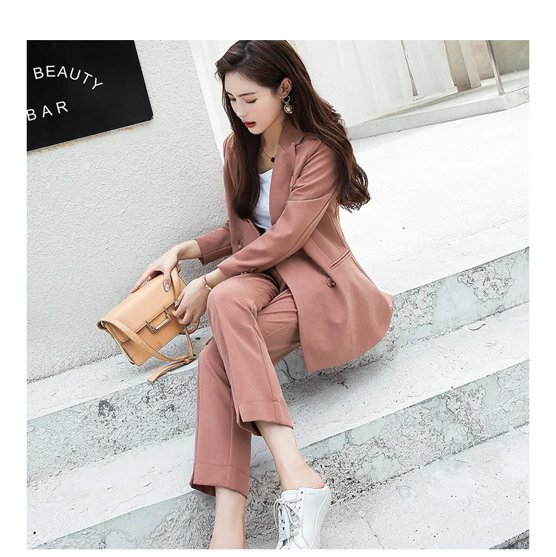 Осенние женские брючные костюмы двубортный зазубренный Воротник пиджак блейзер и брюки с поясом женские рабочие костюмы 2019 DF512 <