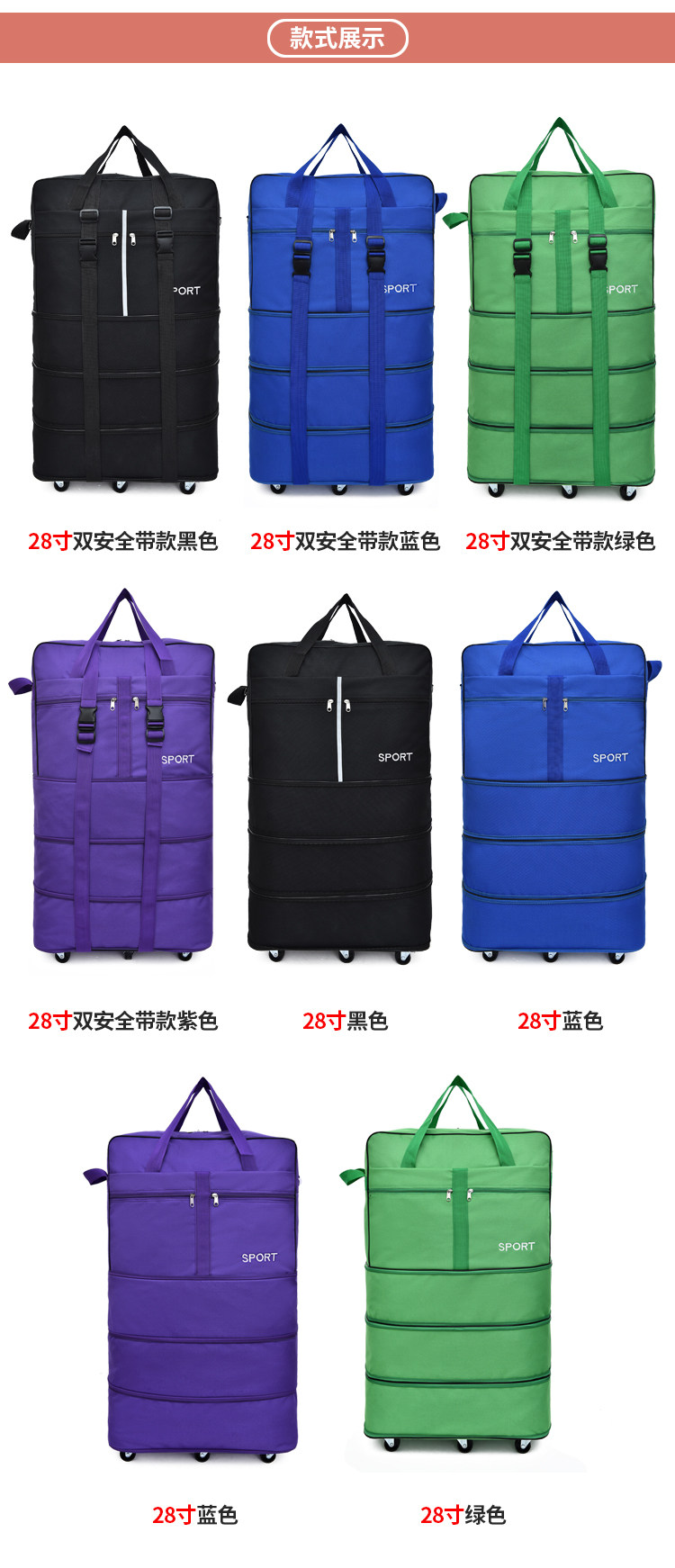| 28-дюймовый 6-колесный Версия | 50*26*82 см | 6 усиленных колес из нержавеющей стали | 2,3 кг | 3 слоя |