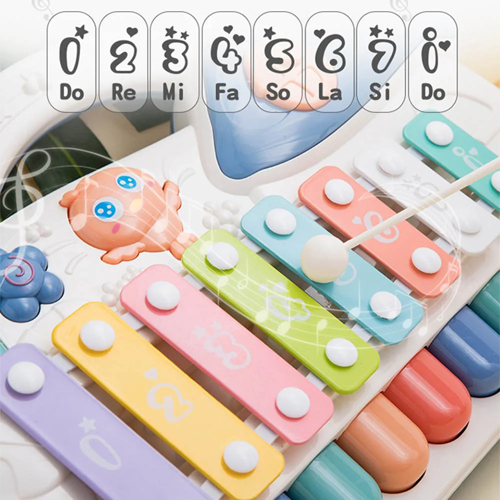 -Биение разных цветов фортепиано сделает другой звук, позволит ребенку найти ритм, нажав на инструмент.