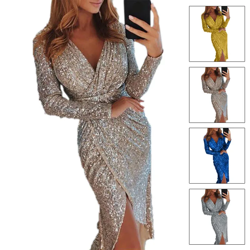 * Описание товара:Женские блестки с длинным рукавом v-образным вырезом мерцающее вечернее сексуальное платье Повседневная модная новинка
