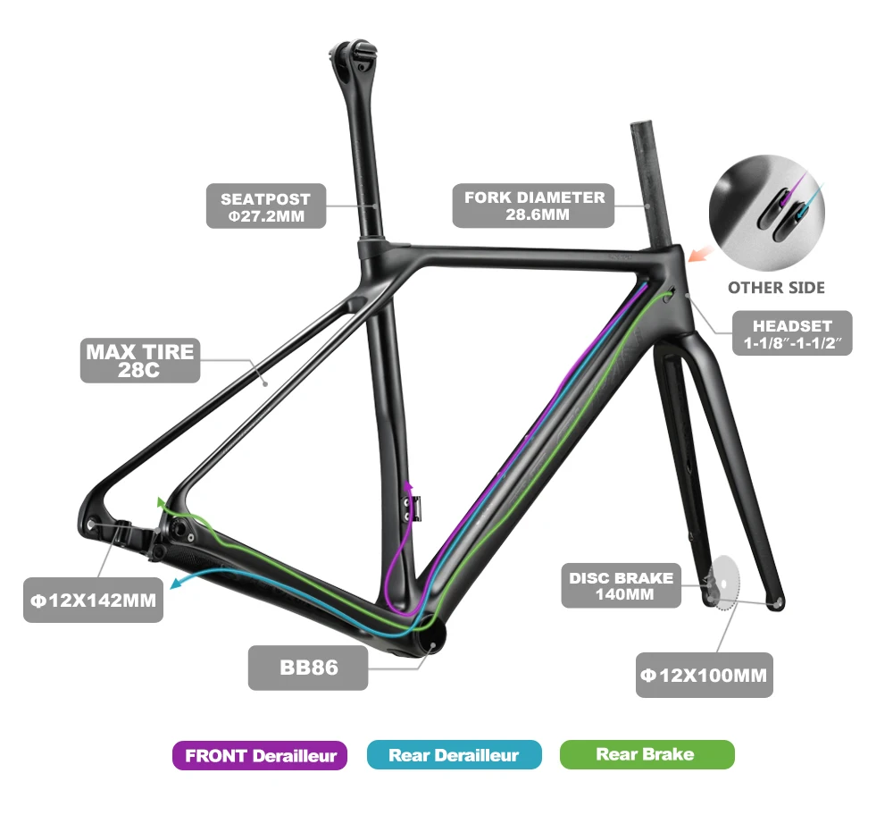 В комплект входят: рама, вилка, стойка для сиденья, зажим, вешалка Гарнитура: 1-1/8 "-1-1/2" Вес вилки: около 389 г +/-10 г Вес Подседельный штырь: 208 г +/-10 г Вес: 1070 г +/-50 г (размер XS) Цвет: серый/черный Нижний Кронштейн: BB86 Гарантия: 2 года Размеры оправы: XS/S/M/L Ткань и отделка: UD & Matte DI2 и механические: обе опоры Углерод: углеродистая рама для дорожного велосипеда Углеродное волокно: T1000 Размер Подседельный штырь: 27,2 мм Диаметр вилки: 28,6 мм Диск Дрейк: 140 мм Максимальная шина: 28C Передний Размер: 12x100 мм Задний размер: 12x142M