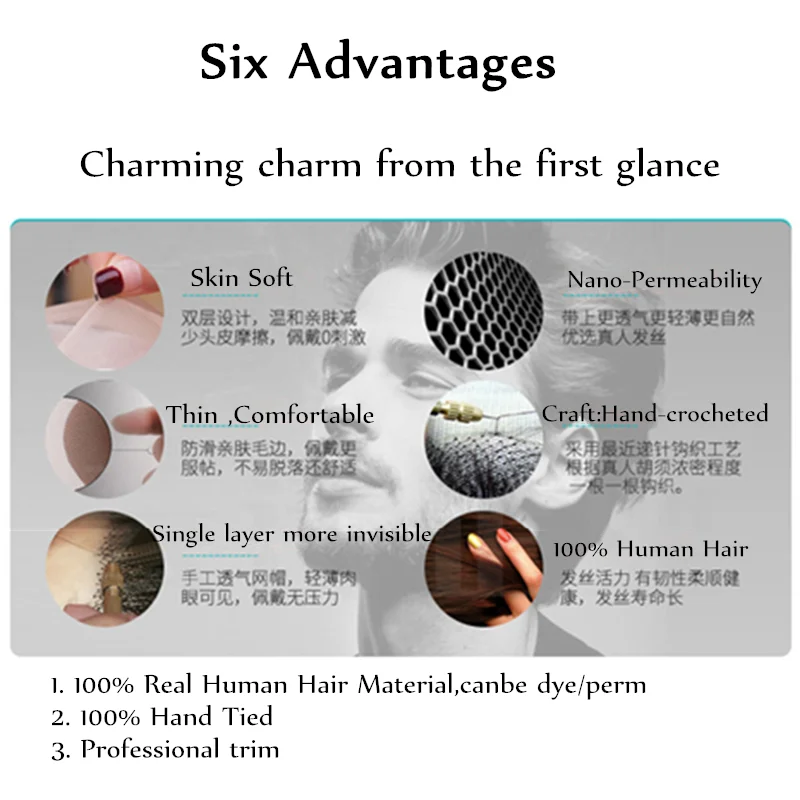 Тип: мужские волосы с усами и бородой Цвет: Естественный цвет (как на изображении) Материал: 100% Человеческие волосы Remy Уникальный стиль: 100% ручная вязка поддельные усы, борода, нано кружево, естественный вид. Натуральный изгиб Тонкий светильник ang, дышащий, удобный, полупрозрачный 100% чистый Покрывало «Русалочка», ручная вязка