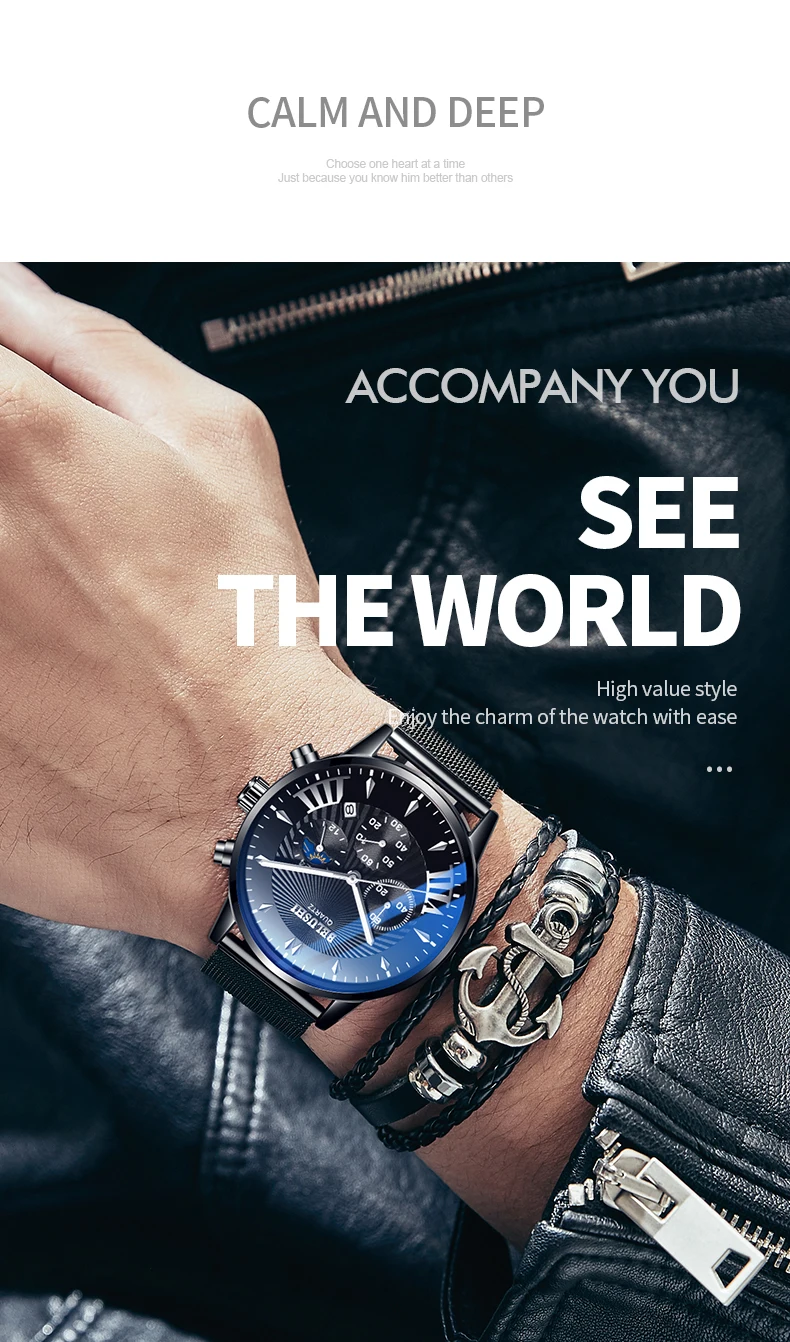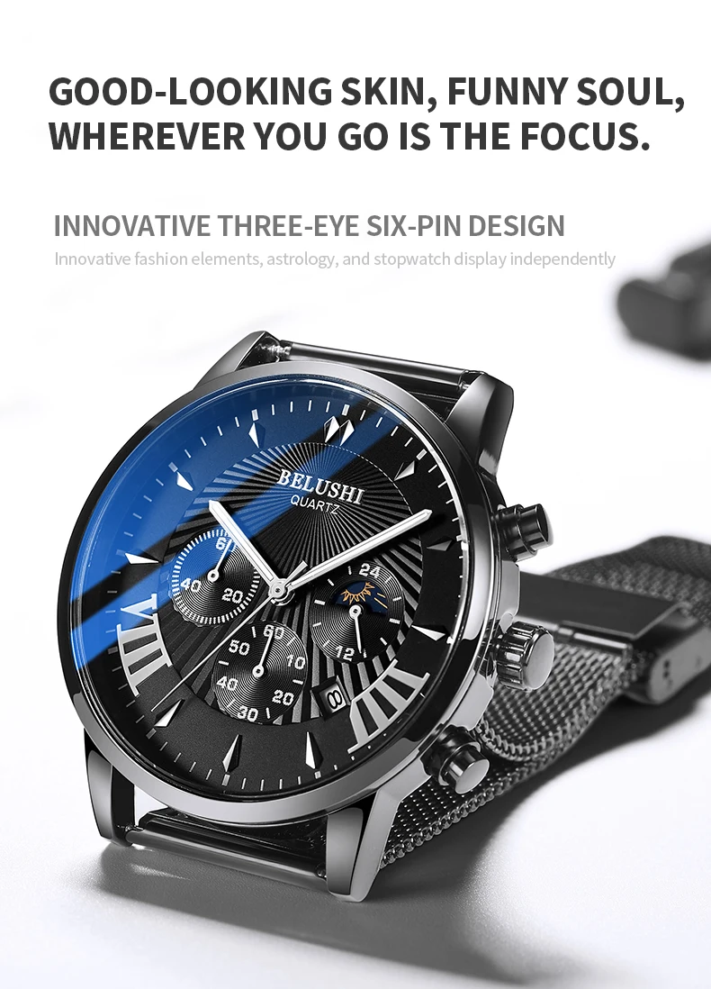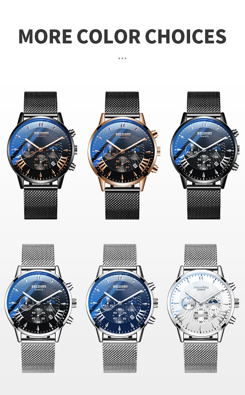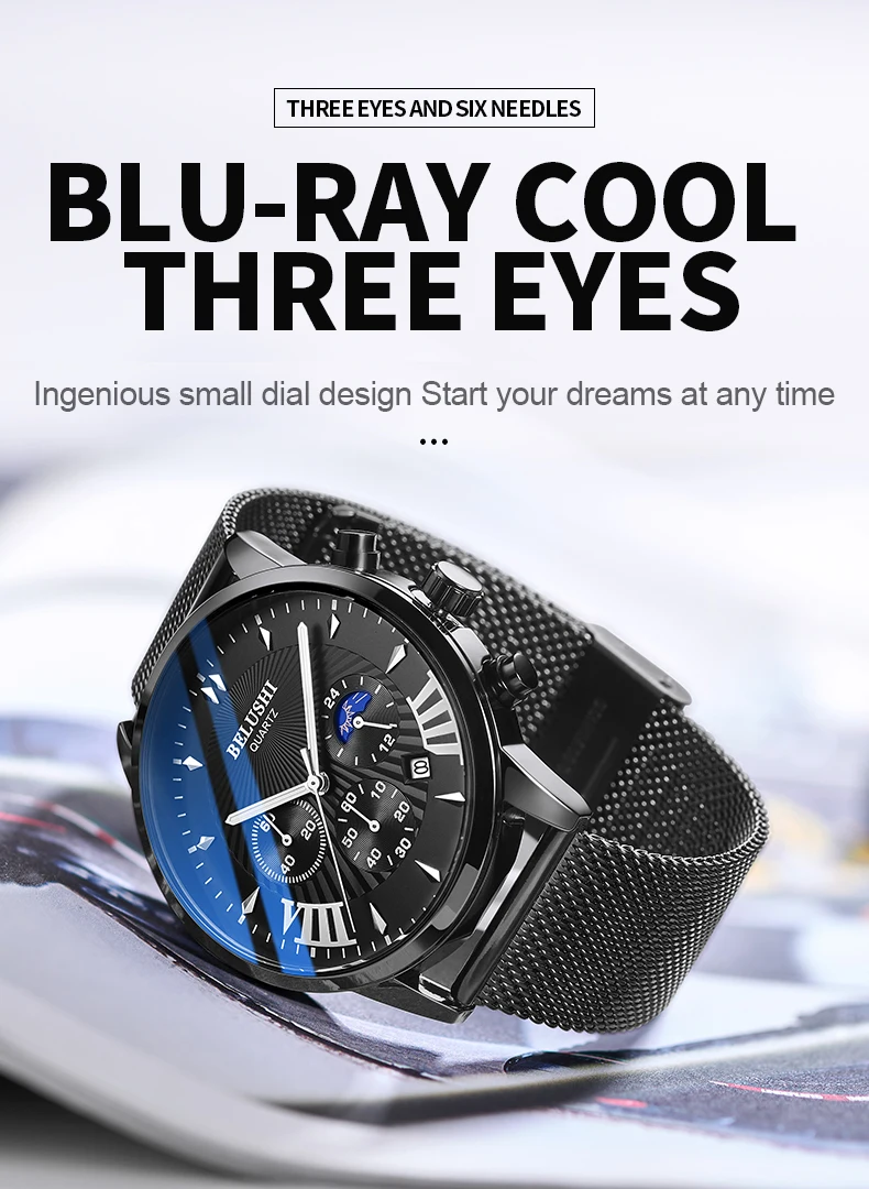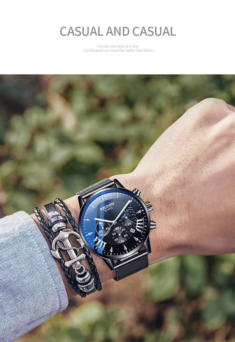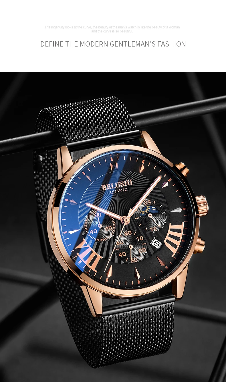 Мужские часы BELUSHI, водонепроницаемые кварцевые деловые мужские часы с хронографом, спортивные кварцевые часы, мужские повседневные полностью Стальные наручные часы 1. Бренд: BELUSHI 2. Со светящимися стрелками и календарем 3. 30 м водонепроницаемость, только для жизни водонепроницаемость. 4. Тип: мужские деловые часы 5. Механизм: японский оригинальный цифровой механизм 6. Есть 13 видов цветов для выбора 8. Ширина ремешка: (приблизительно) 2,2 см 9. Диаметр циферблата: (прибл.) 4,3 см 10. Материал ремешка: сетчатый ремень из нержавеющей стали или кожаный ремешок 11. Материал корпуса: нержавеющая сталь 12. Застежка: потайная застежка 13. Показ точного времени 14. Это хороший подарок для кого-то особенного Примечание: Мы рекомендуем не носить его, когда вы моете руки, пожалуйста, не используйте горячую воду, если вы носите его, чтобы мыть руки. Включенные компоненты: -1 х Оригинальные часы BELUSHI