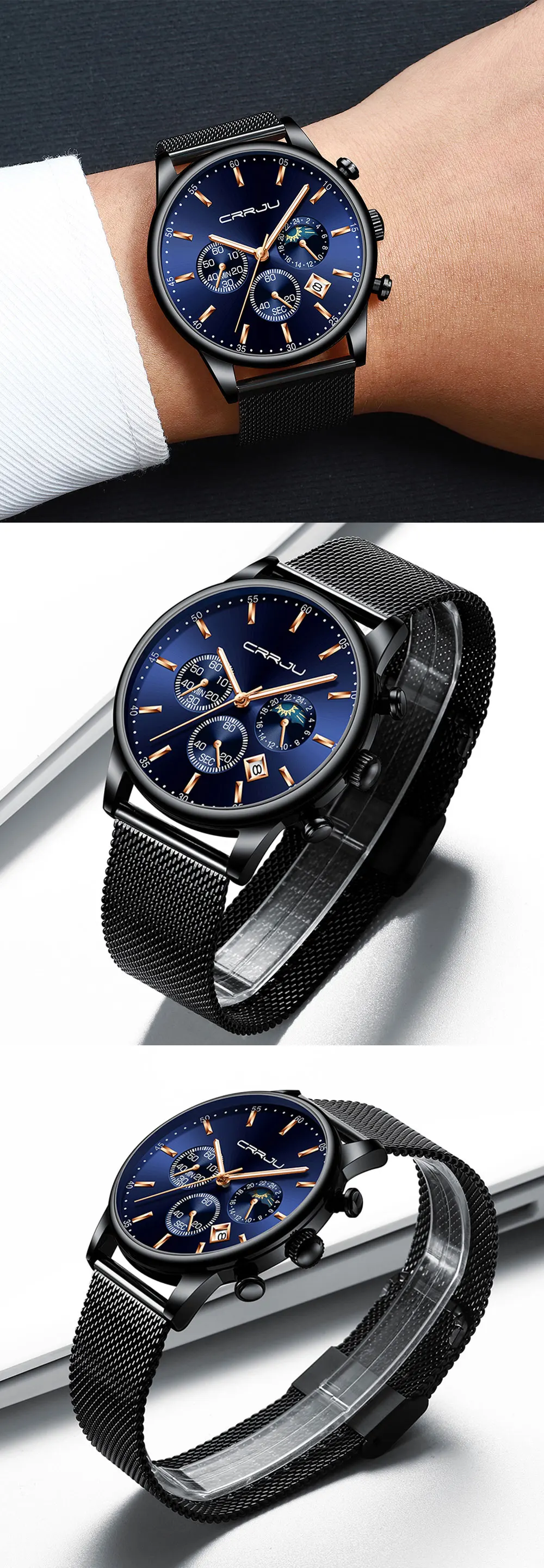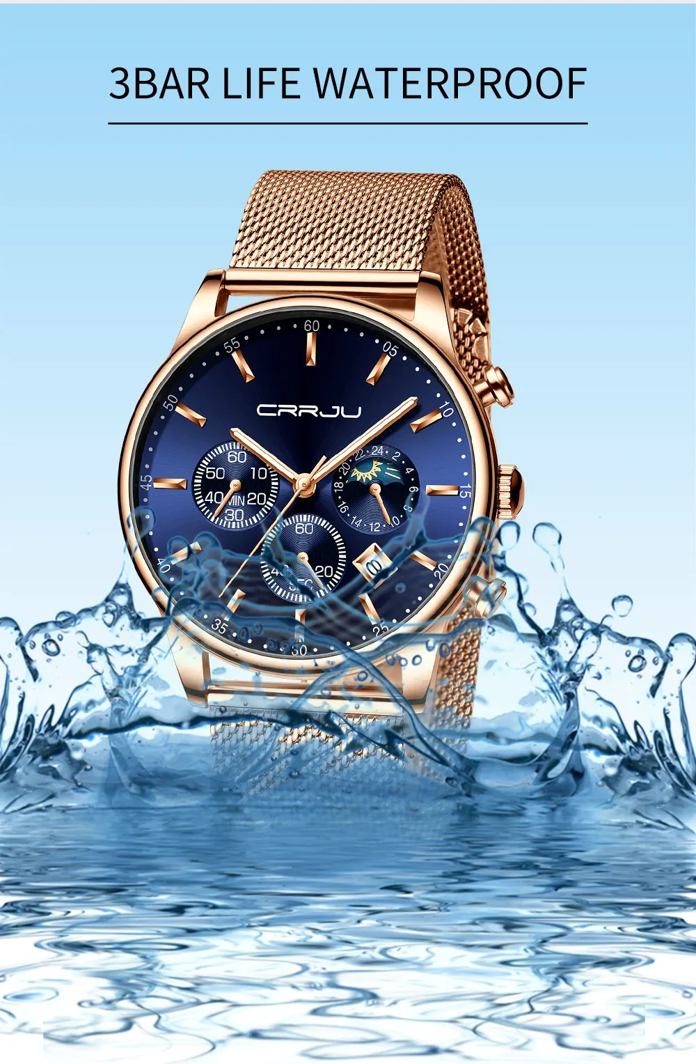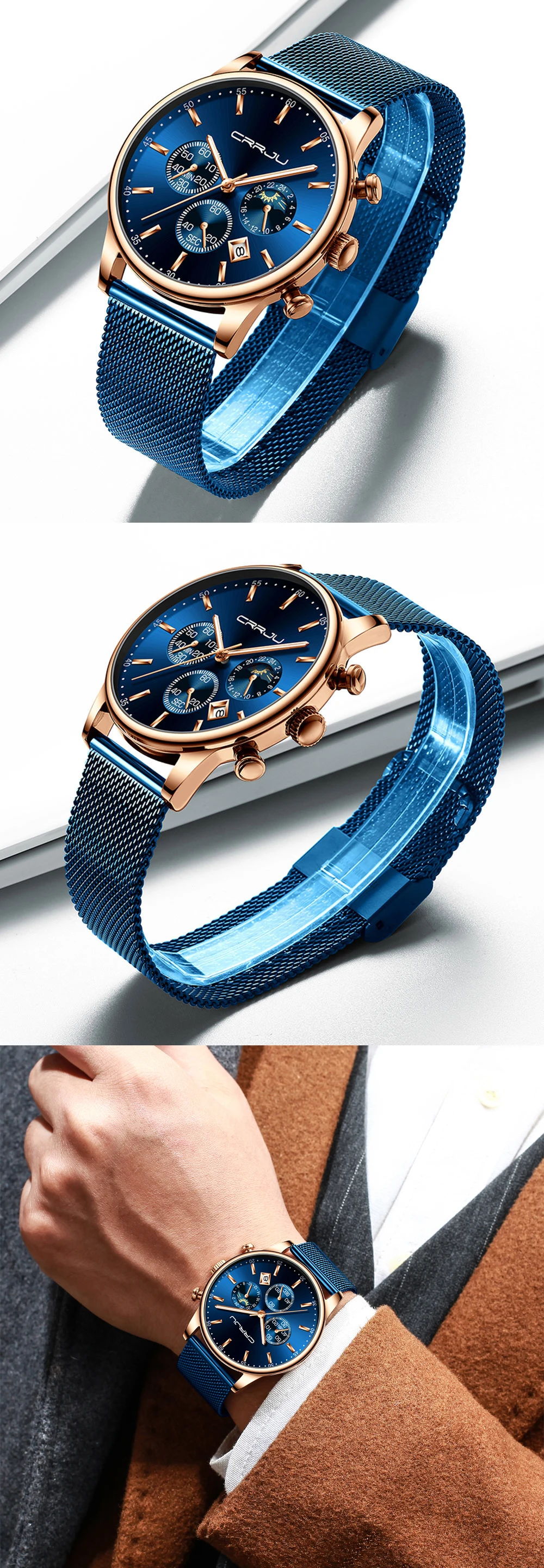 CRRJU новые часы. Часы с голубым сетчатым ремешком и корпусом из розового золота. Это стильные часы для работы и отдыха. С хронографом, автоматическим календарем, водонепроницаемым, противоударным, светящимся и другими функциями; Подходят для всех случаев.
