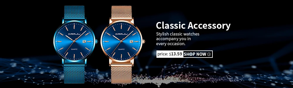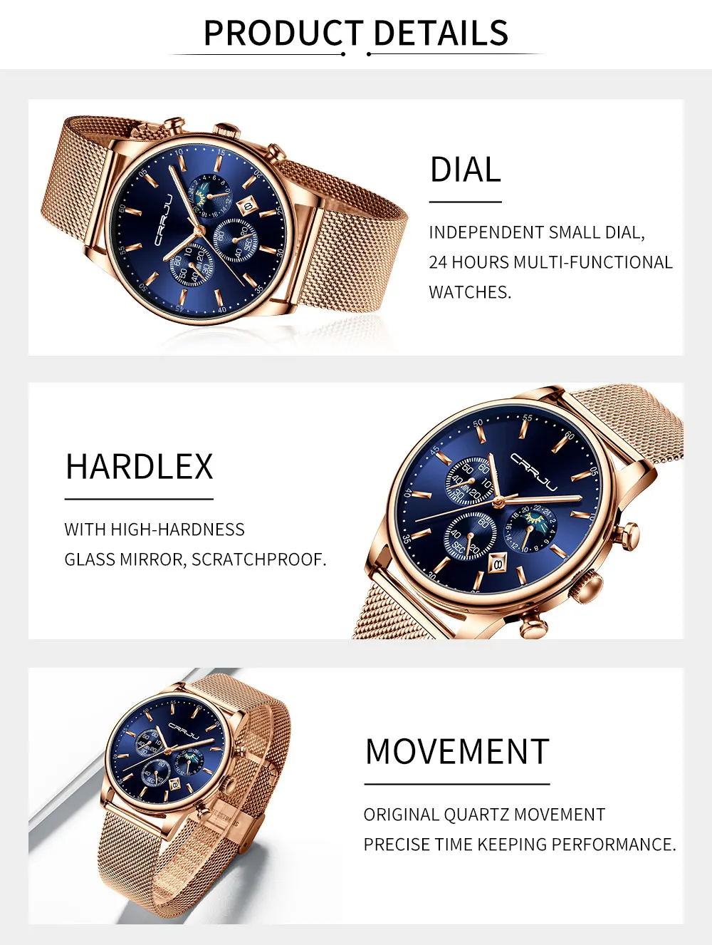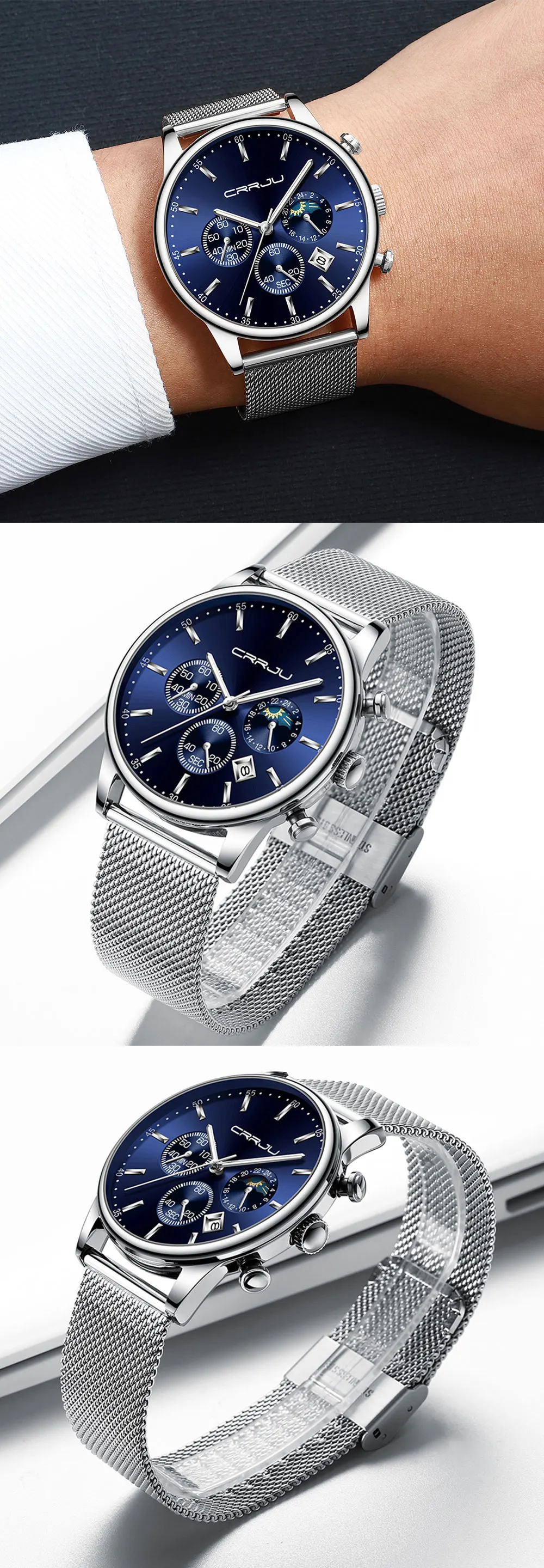 CRRJU новые часы. Часы с голубым сетчатым ремешком и корпусом из розового золота. Это стильные часы для работы и отдыха. С хронографом, автоматическим календарем, водонепроницаемым, противоударным, светящимся и другими функциями; Подходят для всех случаев.