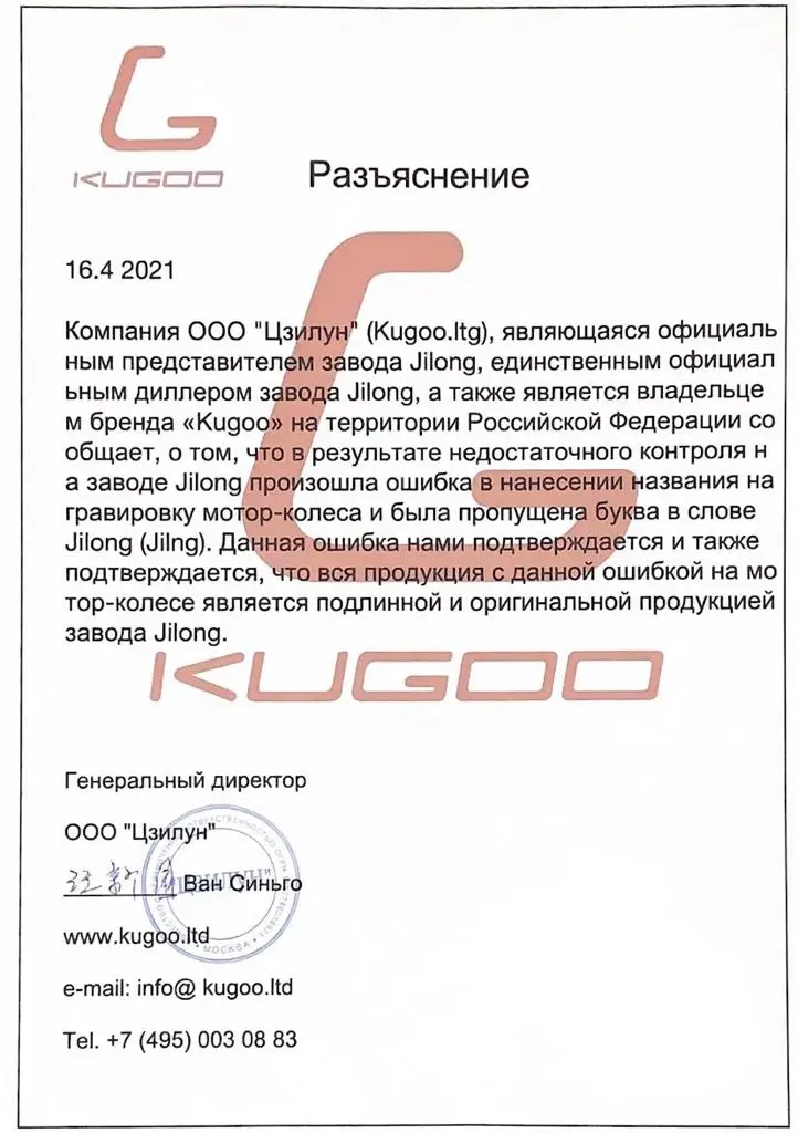 Компания ООО «Цзилун» (kugoo.ltd), являющаяся официальным представителем завода Jilong, единственным официальным дилером завода Jilong, а также является владельцем бренда «Kugoo» на территории Российской Федерации сообщает о том,