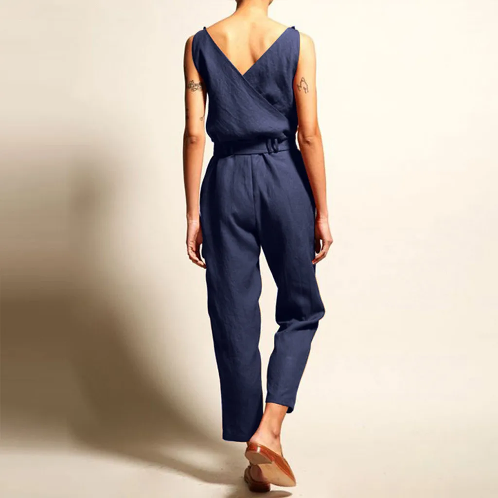 Женский Повседневный однотонный длинный льняной комбинезон без рукавов с v-образным вырезом и поясом размера плюс