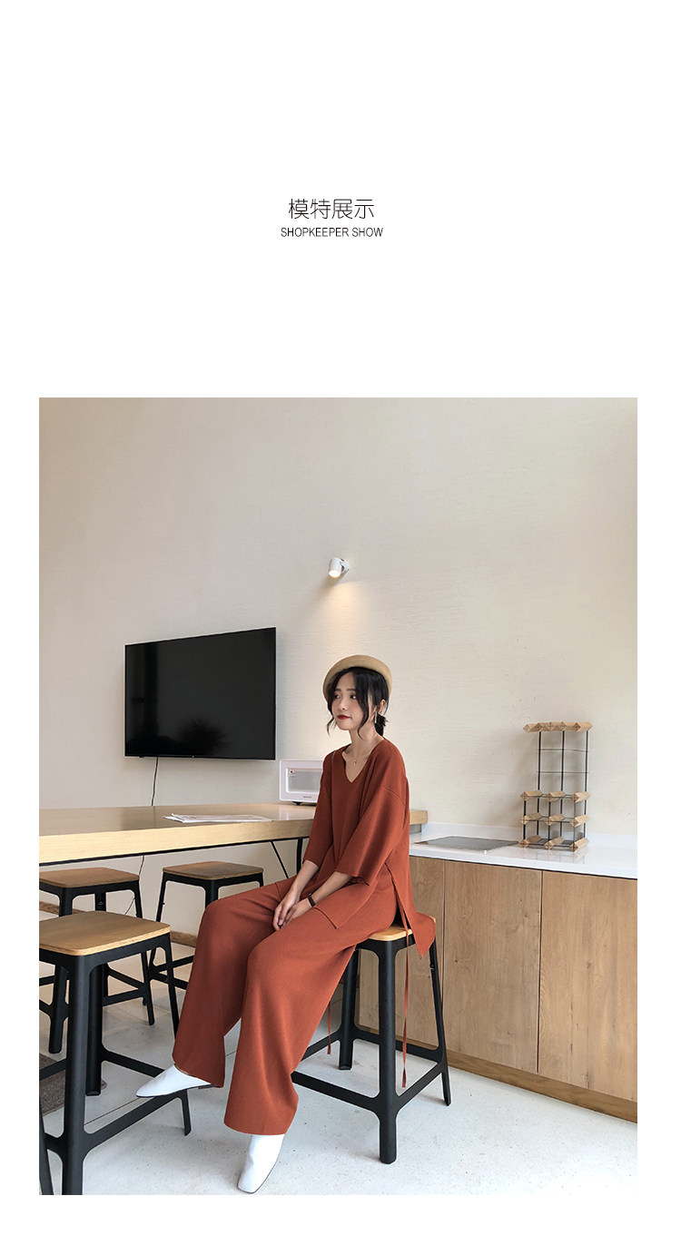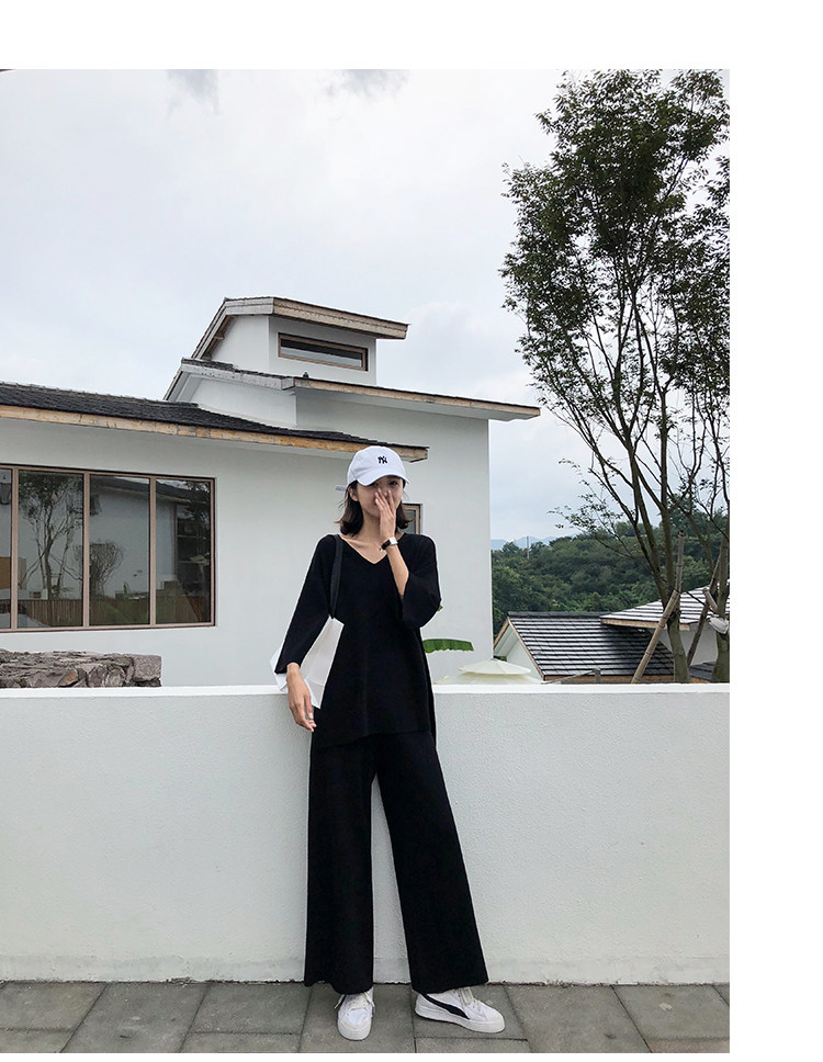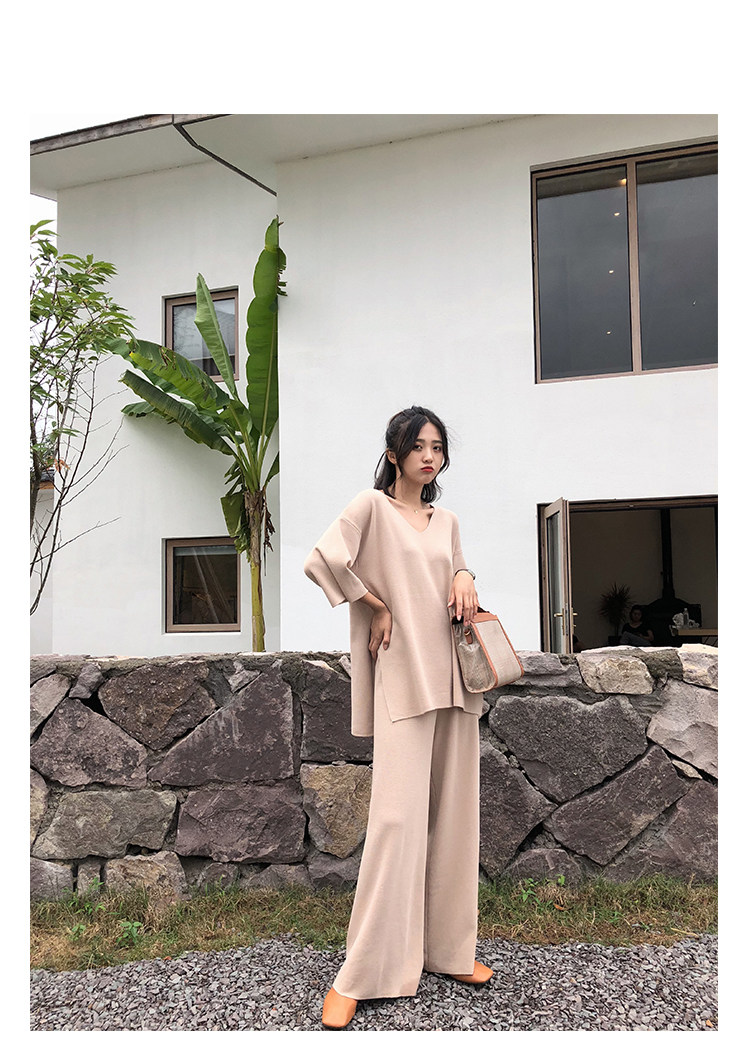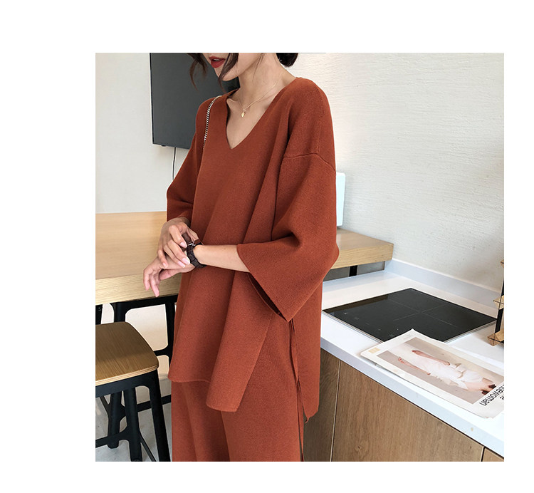 Женский трикотажный свитер, брючный костюм для женщин, комплект из двух предметов, трикотажный пуловер с v-образным вырезом, топ с длинными рукавами, широкие брюки, костюм AE84