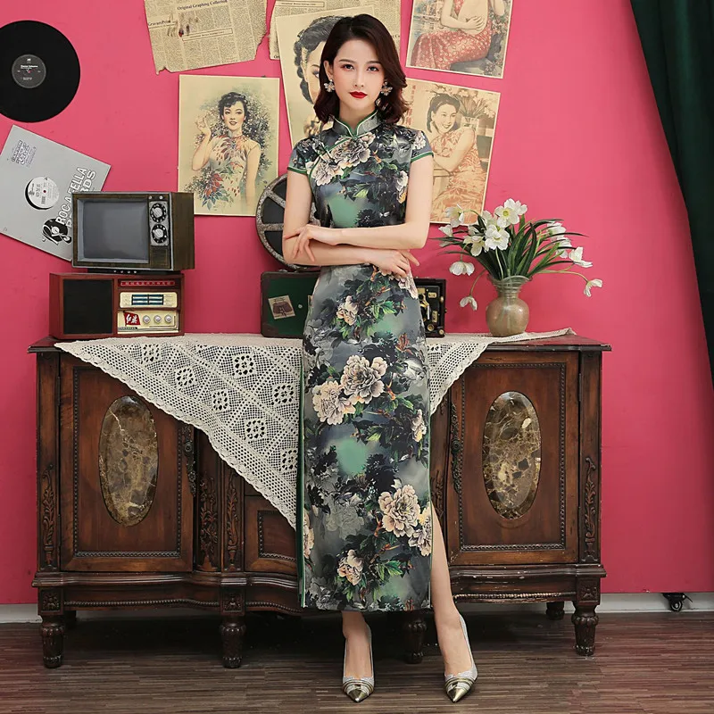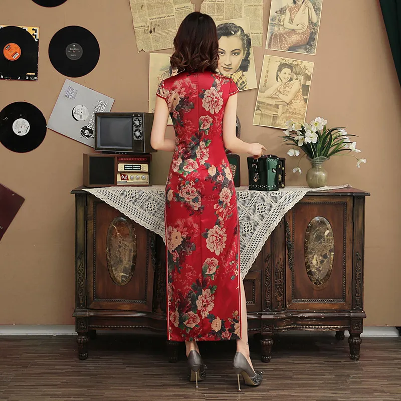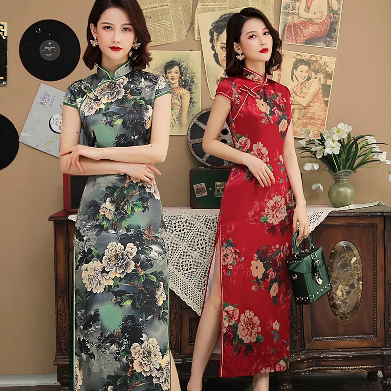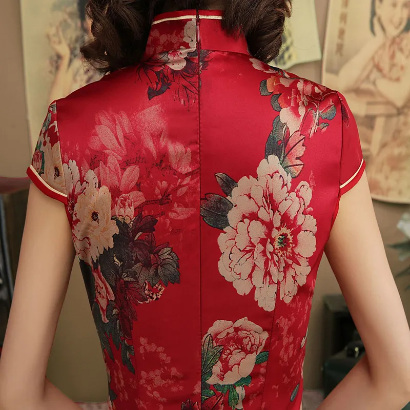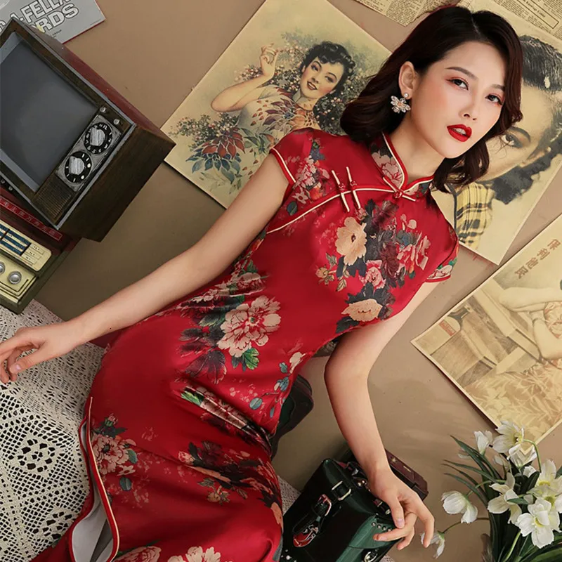 Красное китайское длинное летнее платье Ципао с коротким рукавом и цветочным принтом, винтажное свадебное платье Ципао, большие размеры