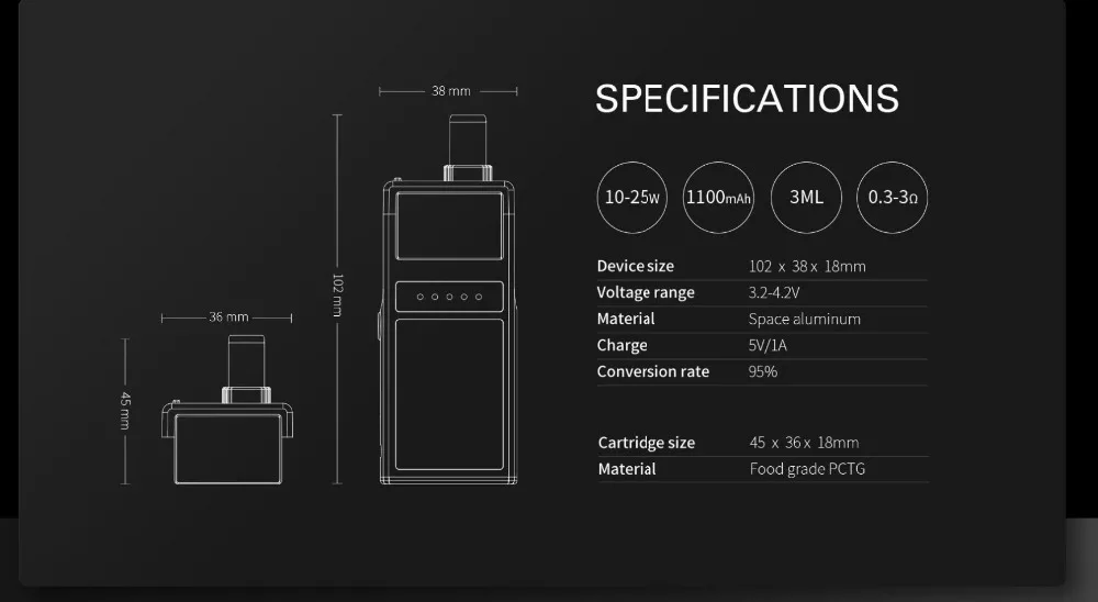 Размер устройства: 102x38x18мм Материал: космический алюминий Емкость аккумулятора: 1100 мАч встроенный аккумулятор Диапазон мощности: 10-25 Вт Емкость стручка: 3 мл Диапазон сопротивления: 0,3-3ohm Диапазон напряжения: 3,2-4,2 V Зарядка: 5 В/1 А Коэффициент конверсии: 95% Размер картриджа: 45x36x18мм Материал картриджа: пищевой PCTG