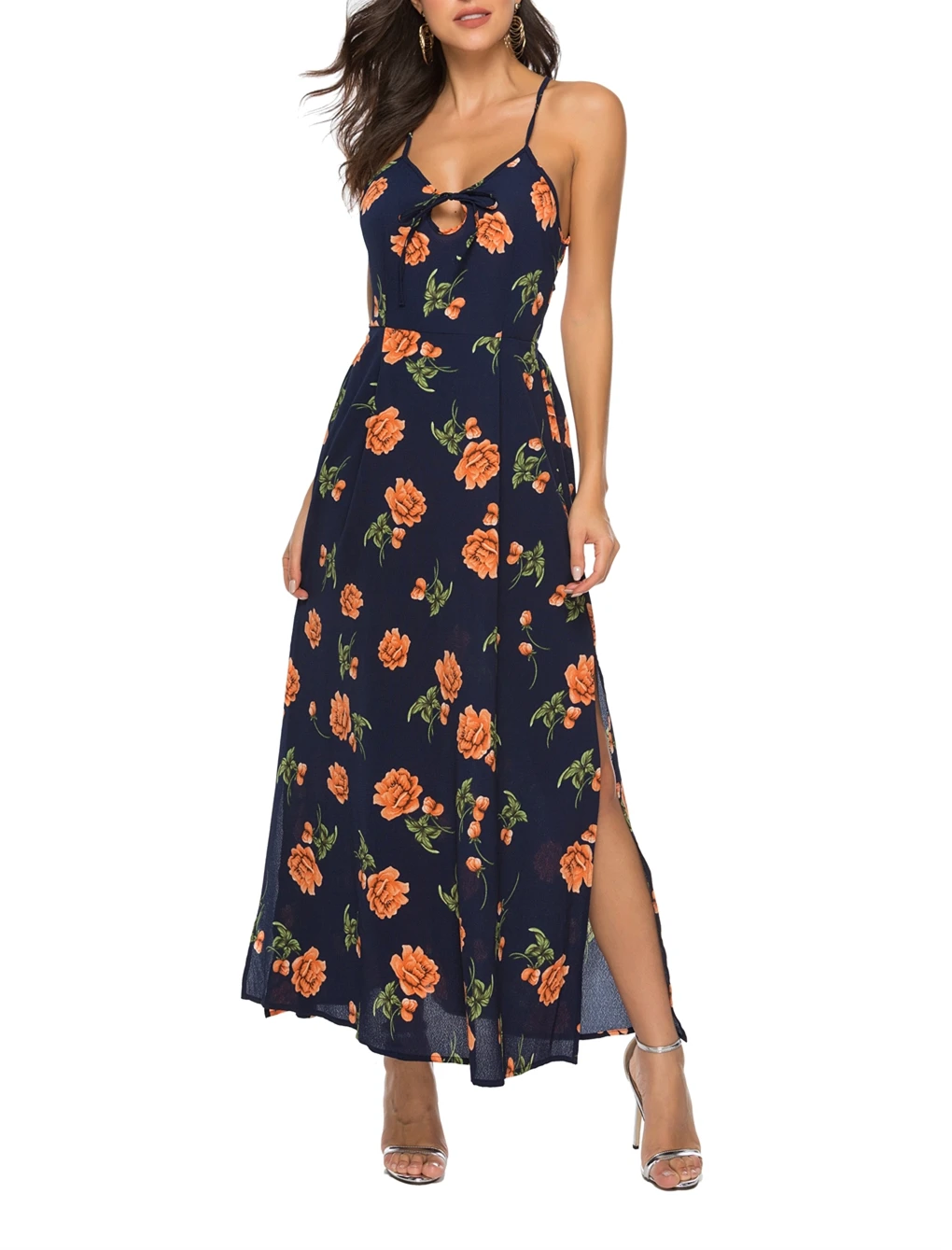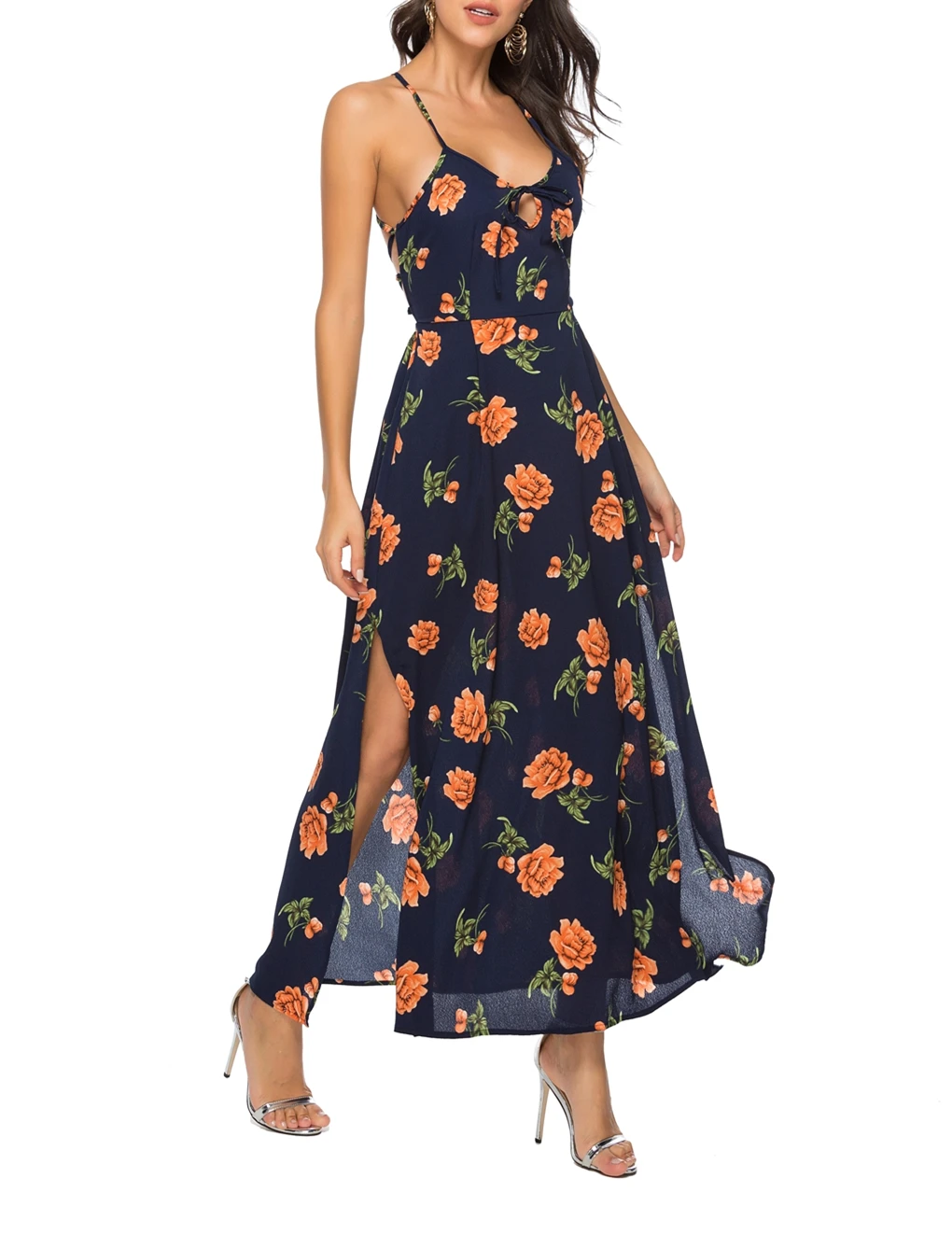 Женские пляжные платья в цветочек, летнее сексуальное платье на тонких бретельках с вырезом на шнуровке, v-образным вырезом и открытой спиной, ТРАПЕЦИЕВИДНОЕ длинное платье с разрезом, Ropa Mujer Артикул: Для женщин платье Размер: S,M,L,XL Сезон: летнее платье для девочек Длина: длинное платье Поддержка: Оптовая и Прямая поставка