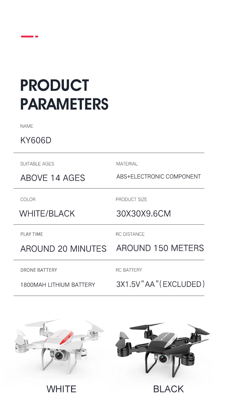 Specification: Product Name: KY606D Camera Drone Product Size: 30*30*10 CM Age: 14+ Remote Control Distance: about 200 meters WIFI Control Distance: within 150 meters Playing Time: about 25-30 minutes per battery,3 battery can last for about 80 minutes Drone Battery: 3.7V 1800mAh Charging Time: about 50 minutes Remote Control Battery:1.5V AA battery Material: ABS Plastic, Electronic components Features: 1.0.3MP + 5MP(1080P) + 4K Camera, WIFI real time transmission,Altitude hold enable you to take stunt clear aerial pictures/videos with a ease. 2.Long flight time, about 30 minutes, longer than most of quadcopters. 2.Foldable arm, easy to carry on and storage. 3.Speed Switched.High/ Medium/ Low speed for choices. 4.Headless Mode+one-key return, simplify your control. 5.LED Lights 6.Forward/Backward, Ascend/Descend,Turn left/right, Left/right Side Flight, Fine tuning, etc. Package Included: Drone*1 Remote Control*1 Spare Propellers*4 USB Charger*1 Protection Frame*4 Drop-proof Floor Stand*2