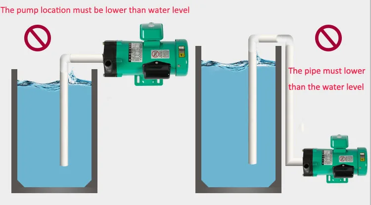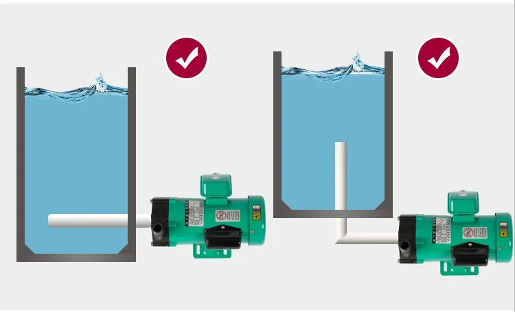 Правильное место установки Расположение насоса должно быть ниже, чем рычаг воды Расположение соединительной трубы должно быть ниже уровня воды. Примечание: насос не является самовсасывающим насосом, не допускается сушка (без воды внутри, чтобы открыть насос)