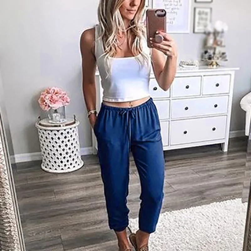 * Описание товара:Женская одежда, лето, укороченные брюки с низкой талией, повседневные спортивные, брюки на шнурке, пляжные Вечерние