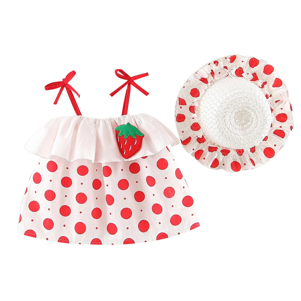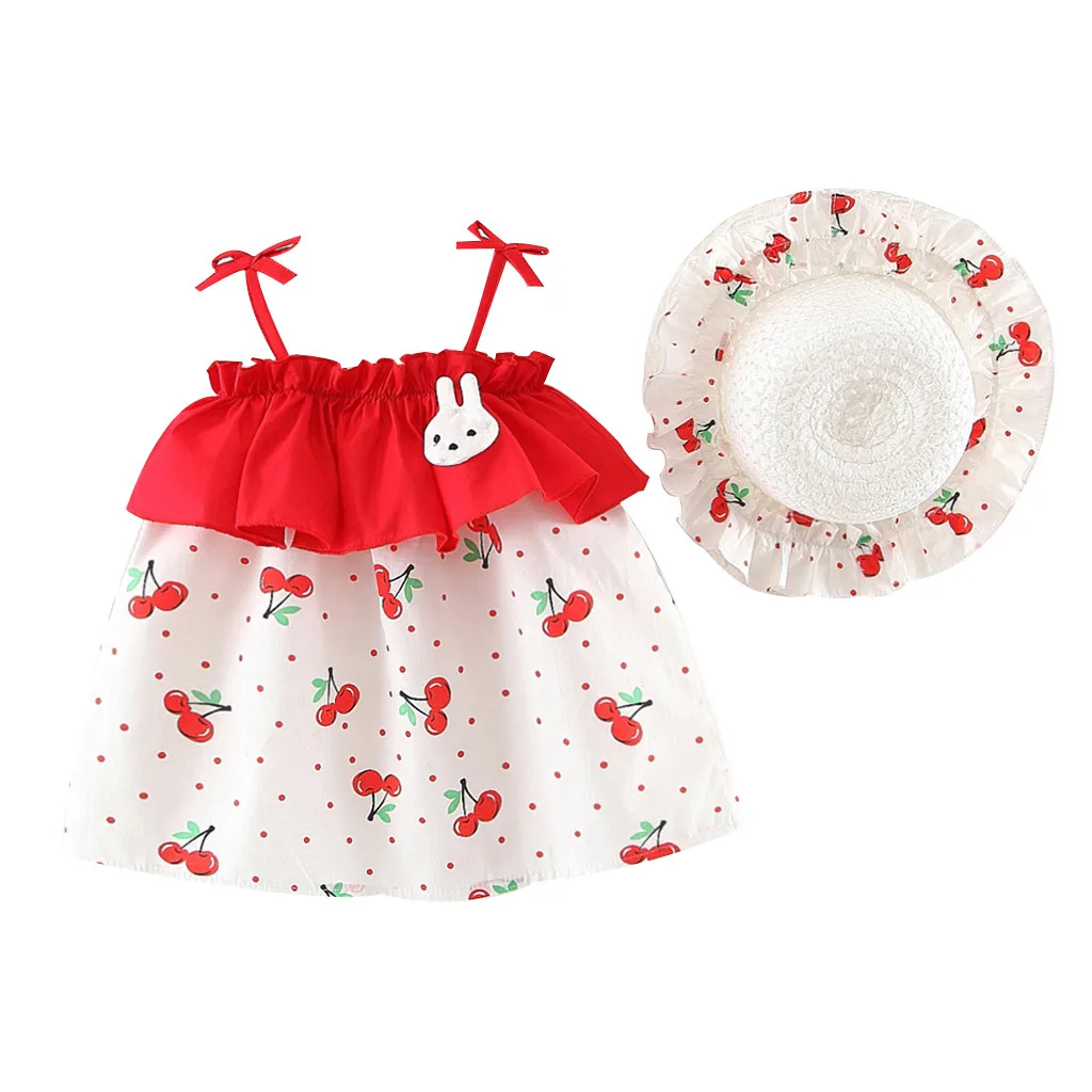 Платья принцессы без рукавов в горошек с принтом вишни для маленьких девочек, шляпа