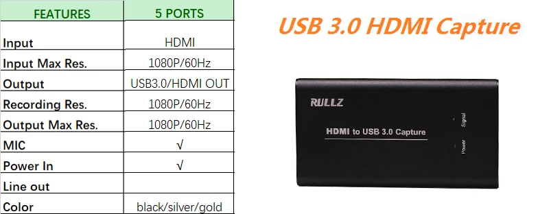 Этот Rullz 5 портов HDMI к USB3.0 видео захвата ключ, он легко носить с собой, имеют превосходную производительность,