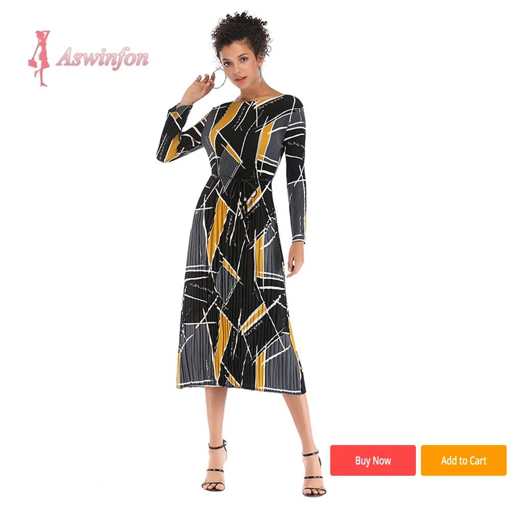 Женское плиссированное платье-трапеция Aswinfon, винтажное шифоновое платье миди с геометрическим рисунком и длинным рукавом, с плавным подолом