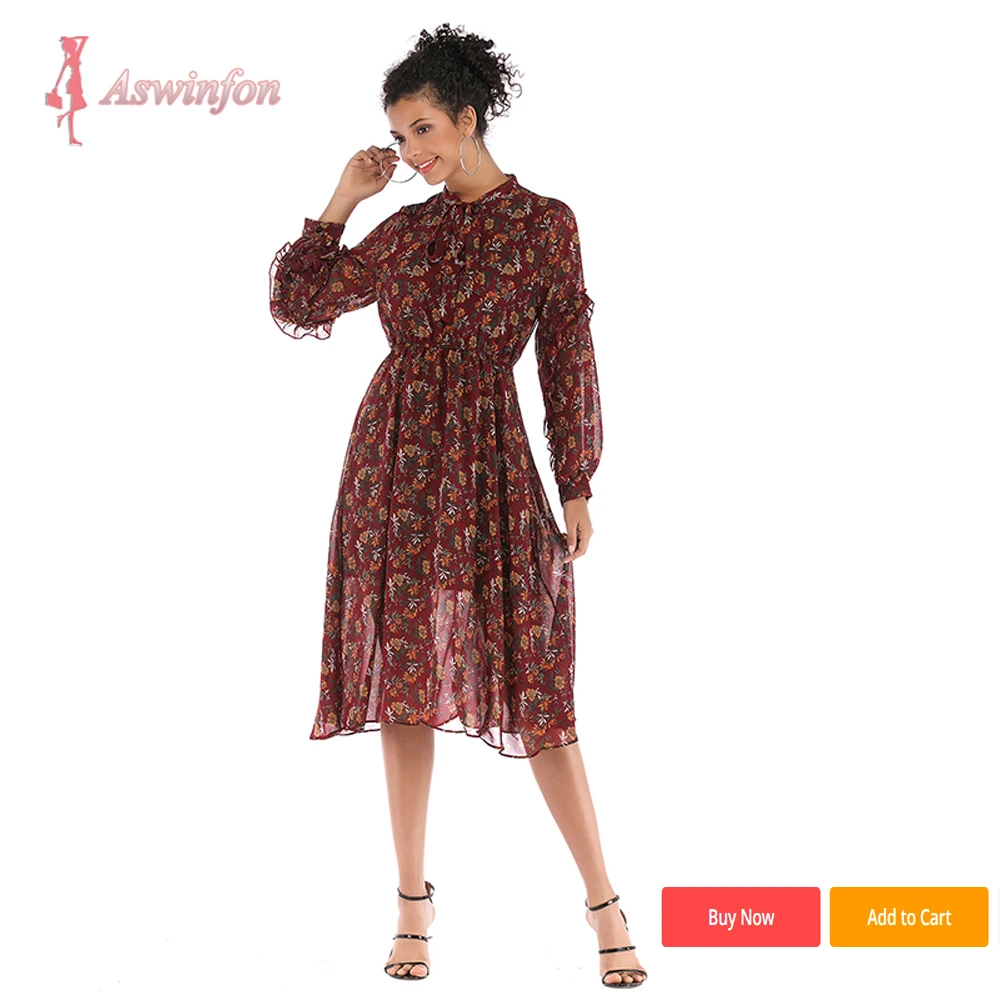 Шифоновое платье-миди с а-силуэтом Aswinfon, платье с длинным рукавом и цветочным принтом, осенние платья с плавным подолом