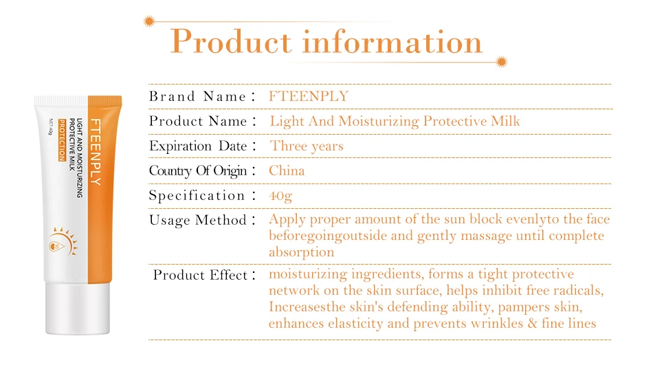 Способ использования: нанесите правильное количество солнечного блока равномерно на лицо перед выходом на улицу и аккуратно массируйте до полного поглощения