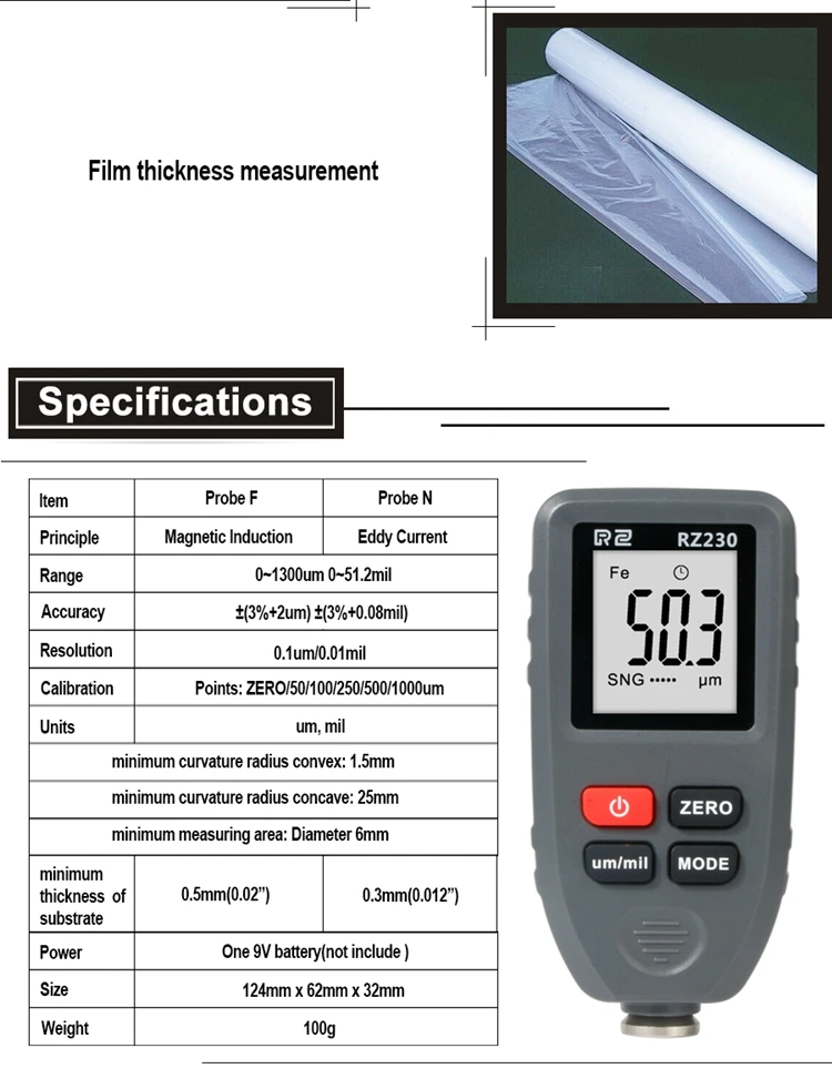 RZ230 портативный цифровой датчик толщины покрытия 0-1300um машина краска для тела тестер толщины пленки um/mil металлическая основа ширина измерения