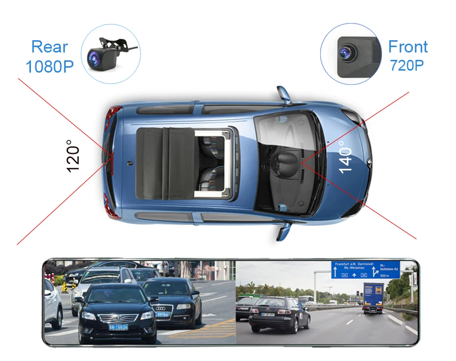 Это устройство поставляется с двумя широкоугольными камерами и может для передней и задней части вашего vehide.Фронтальная 720P, Rear1080P; Две HD камеры могут записывать одновременно автоматически захватывая каждый мимолетный момент.