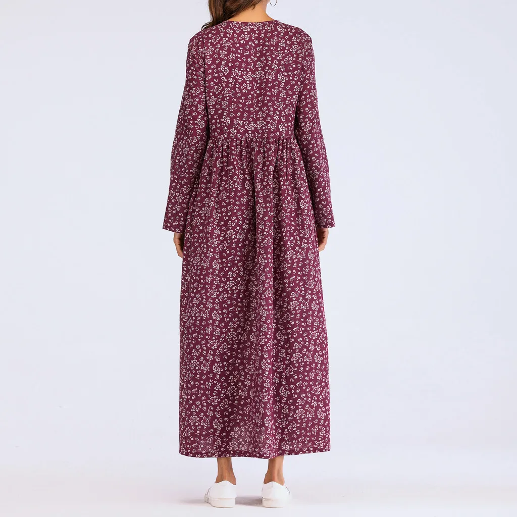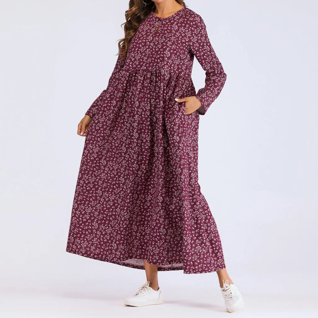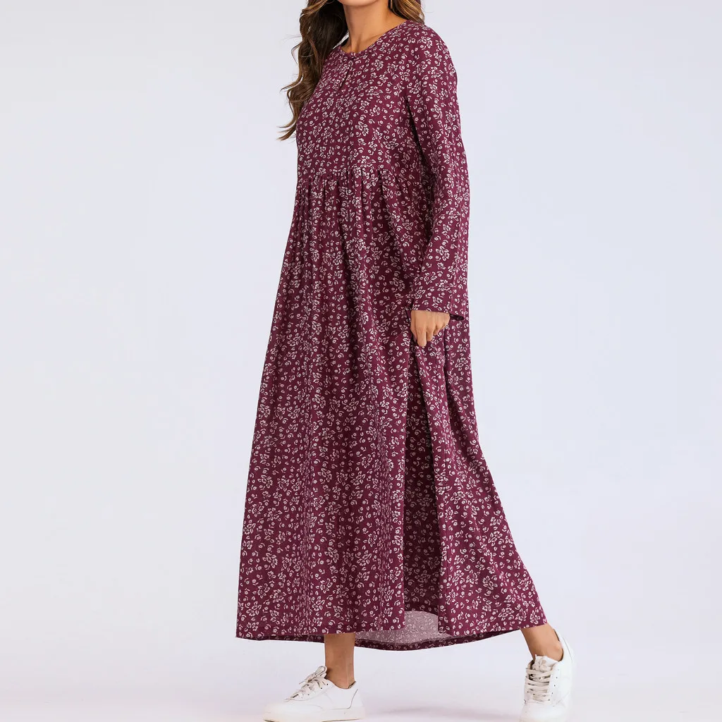 Женское длинное платье с длинным рукавом и рюшами, повседневное тонкое хлопковое свободное платье с цветочным принтом, кафтан