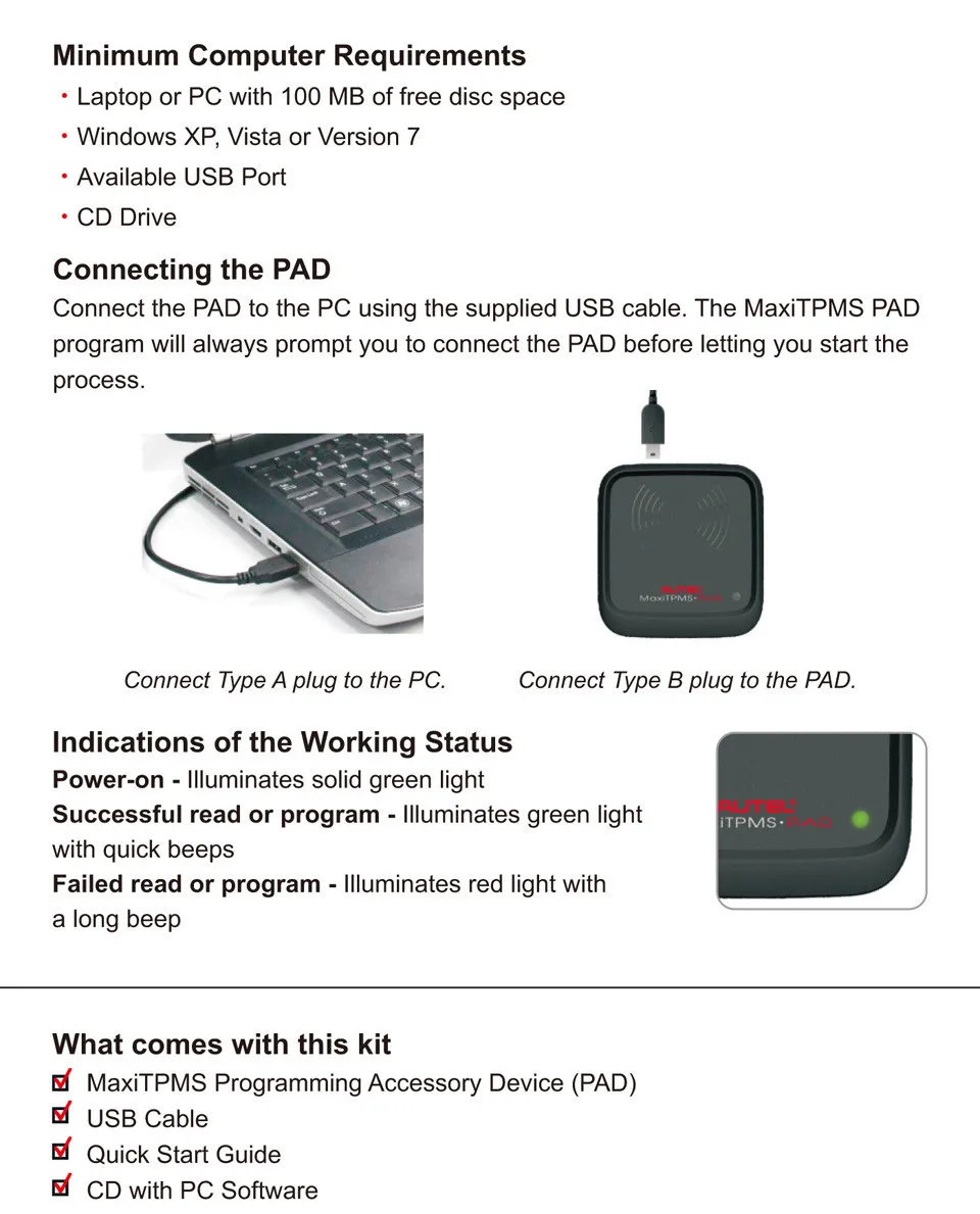 Устройство для программирования MaxiTPMS (PAD)-это идеальный инструмент для активных магазинов, он высвободит ваши инструменты активации TPMS для важных проектов. При подключении к вашим окнам простая в использовании панель MaxiTPMS может быстро тестировать и клонировать четыре универсальных типа Autel MX-Sensor. Обратите внимание, что, так как MaxiTPMS PAD не является инструментом, основанным на подписке, так что это нормально, ошибка регистрации.