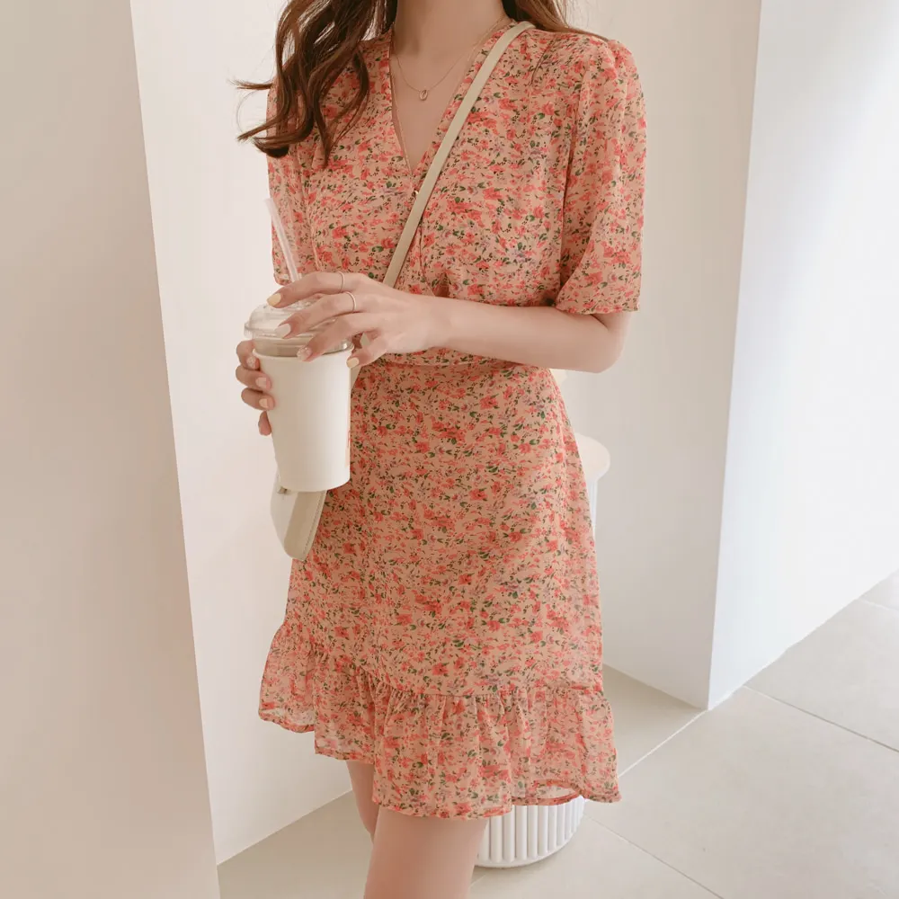 Шифоновые Платья с цветочным рисунком, женское летнее платье с короткими рукавами в японском стиле, милое платье в консервативном стиле с v-образным вырезом, ТРАПЕЦИЕВИДНОЕ мини-платье с оборками, 6513
