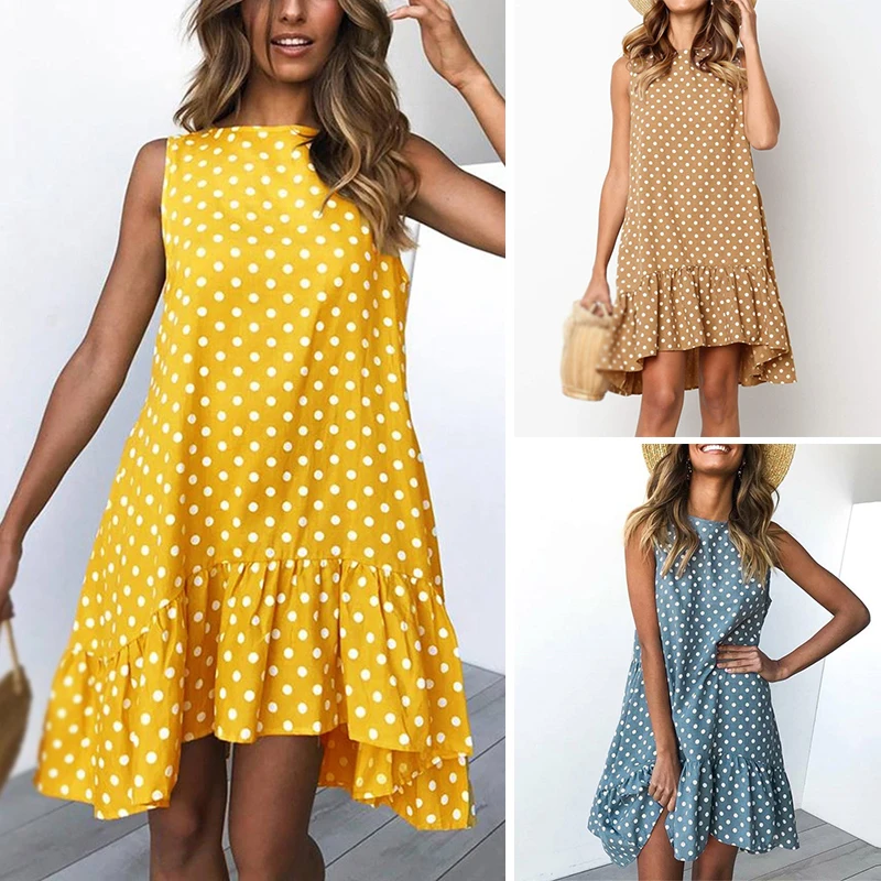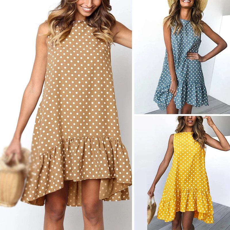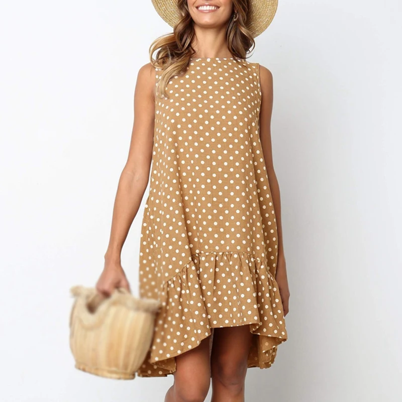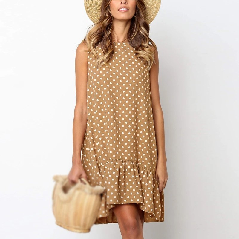 * Описание товара: круглый вырез; без рукавов; горошек; свободный; большие качели; платье с оборками
