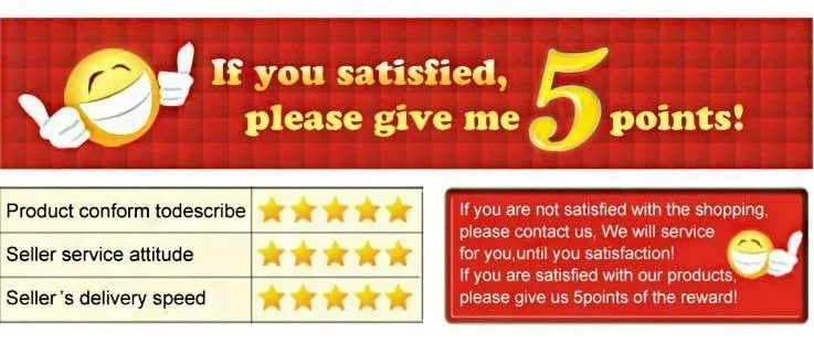 Для покупок 1. Перед оплатой, пожалуйста, подтвердите заказ цвета, количества и размера, если выбор товара не ясен, вы можете оставить сообщение, чтобы сказать мне, я помогу вам. 2. Пожалуйста, убедитесь, что у вас есть адрес и контактная информация, чтобы облегчить почтовое отделение, чтобы получить вашу посылку вовремя. 3. Если вы хотите купить больше, вы можете отправить мне сообщение, я дам вам скидку. 4. Мы объявим как подарки или образцы с низкой стоимостью. Для обратной связи 1. Если вы удовлетворены нашими продуктами и услугами, пожалуйста, оставьте положительный отзыв и 5 звезд. И оценить качество товара на 5 звезд. Как только вы покажете нам скриншот как 5 звезд, мы предоставим вам скидку для вашего следующего заказа. 2. Если вы не удовлетворены нашими портами, пожалуйста, свяжитесь с нами, прежде чем оставить отрицательный отзыв или сделать подробную оценку. Мы гарантируем, что вам понравится любая проблема. Надеемся на ваше понимание и поддержку. Для доставки 1. Время подготовки: нам нужно 5-10 рабочих дней, чтобы подготовить ваш заказ в соответствии с нашими многочисленными заказами каждый день.