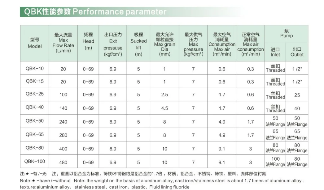 Тип: QBK-15 Материал корпуса: ПП или ПВДФ Материал диафрагмы: резина NBR или F46 Максимальный расход: 20 л/мин Головка: 0-69 м Выход Давление: 6,9 кгс/cm2 Подъем всасывающей головки: 5 м Максимальный диаметр зерна: 1 мм Максимальное давление подачи: 7 кг/см2 Максимальный расход воздуха: 0,6 m3/мин Нормальна воздушной потребление: 0,3 m3/мин Вход и выход: BSPT Резьба 1/2"